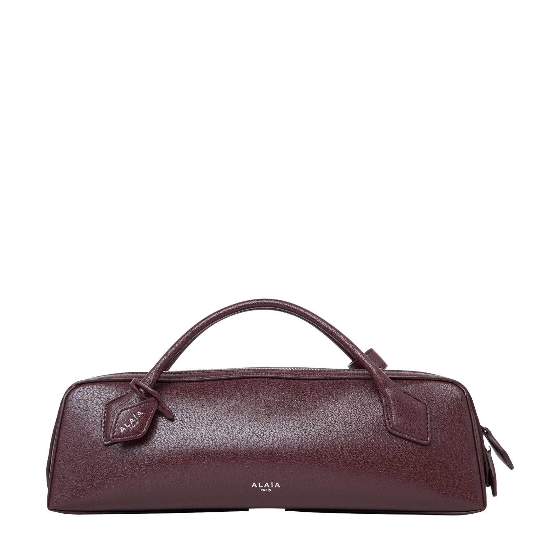 • Elongated shape, tubular short handles with decorative ties, double zip closure, small removable mirror on the inside pocket
