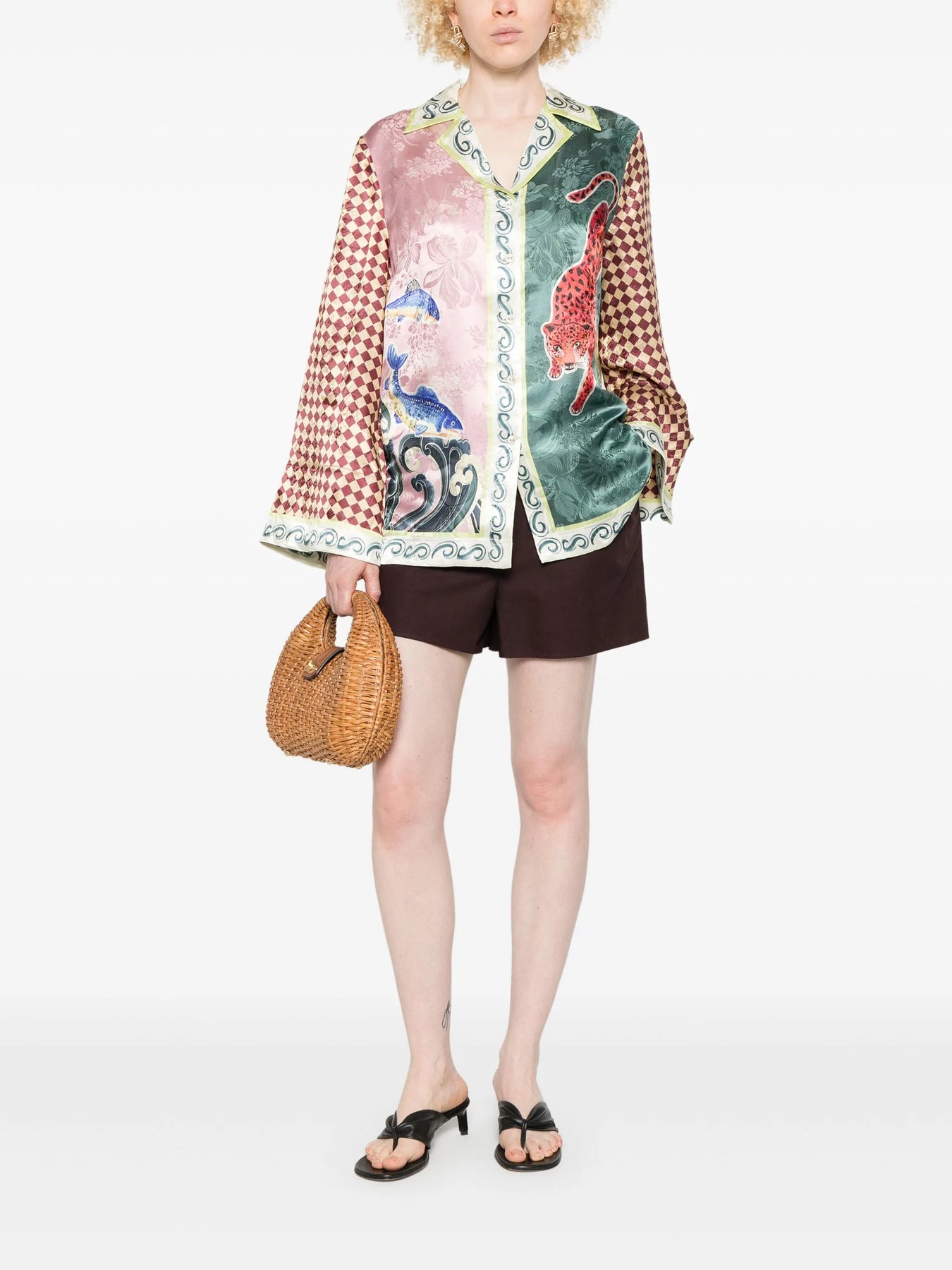 The ALEMAIS Rochester Shirt delivers eclectic artistic expression with Japanese-inspired motifs and vibrant storytelling through prints. Crafted from premium silk with contrasting panels featuring koi fish, leopard prints, and traditional wave patterns in pink, teal, and checkerboard designs. The oversized silhouette and ornate collar detailing create a statement piece that celebrates cultural artistry and contemporary fashion.
