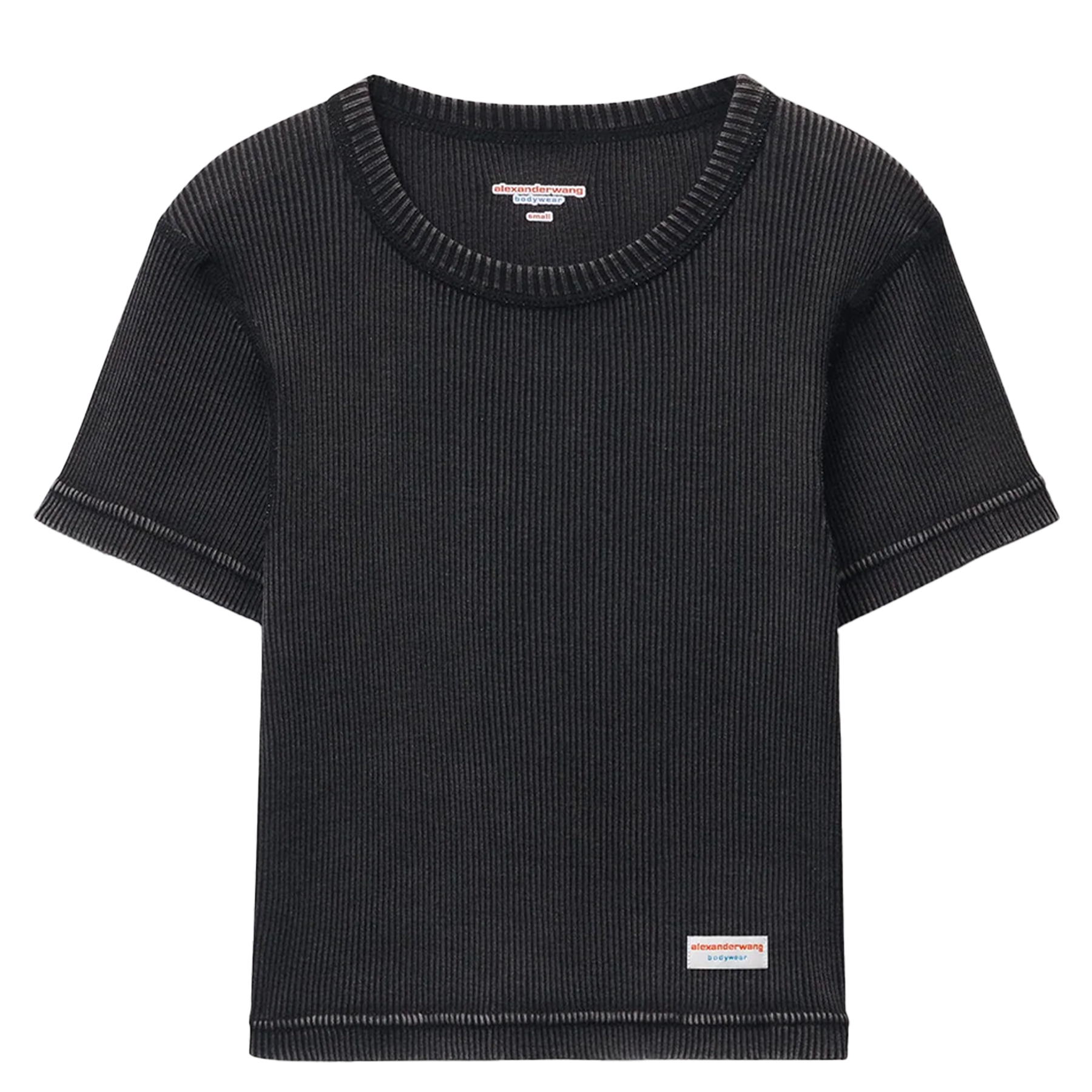 Cropped baby tee in a black wash with ribbed neckline and logo flag tag.
