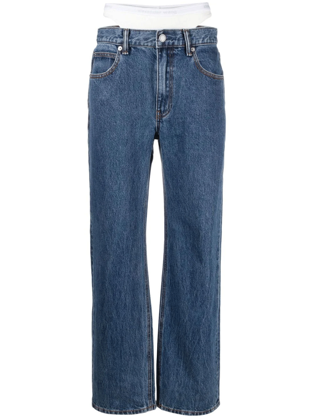 Embrace a playful noughties vibe with Alexander Wang's Loose Jean Skinny White Undie, a riff on nostalgic styles. These blue denim wonders, boasting a low-rise silhouette and a signature layered design with a white cotton underlay, are a playful nod to Wang's unique fashion aesthetic.