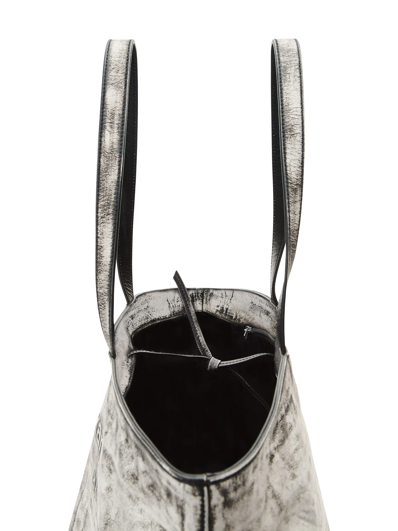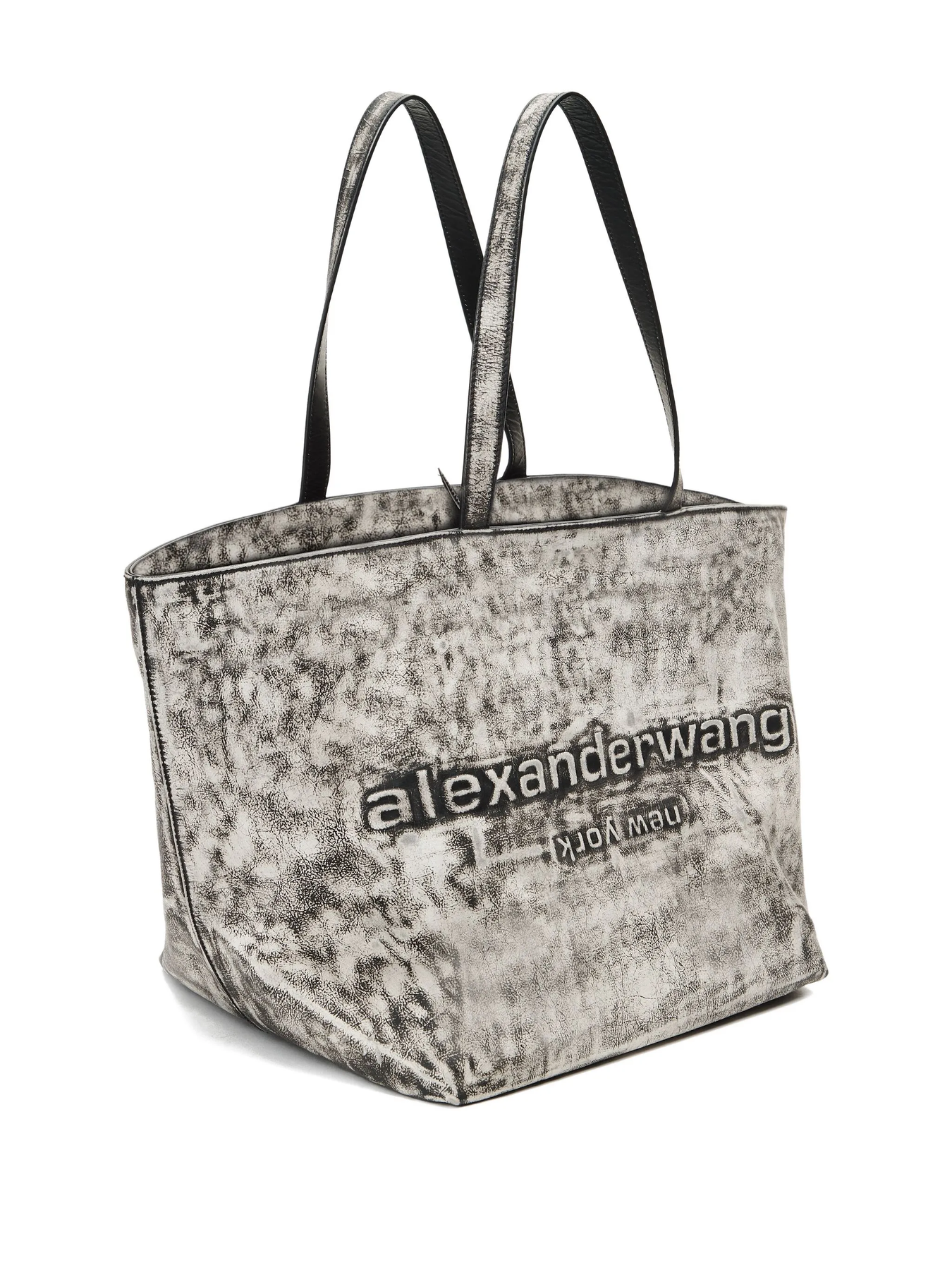 Featuring a tonal raised "Alexanderwang" logo at the center front, this black and white large tote is handcrafted from brush-off effect leather, giving each bag a one-of-a-kind finish. Designed with function in mind, it includes an interior back wall pocket sized for a laptop, two oversized handles, and a hidden tie closure at the top.