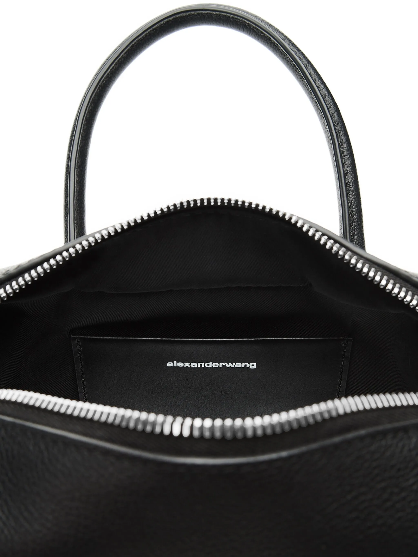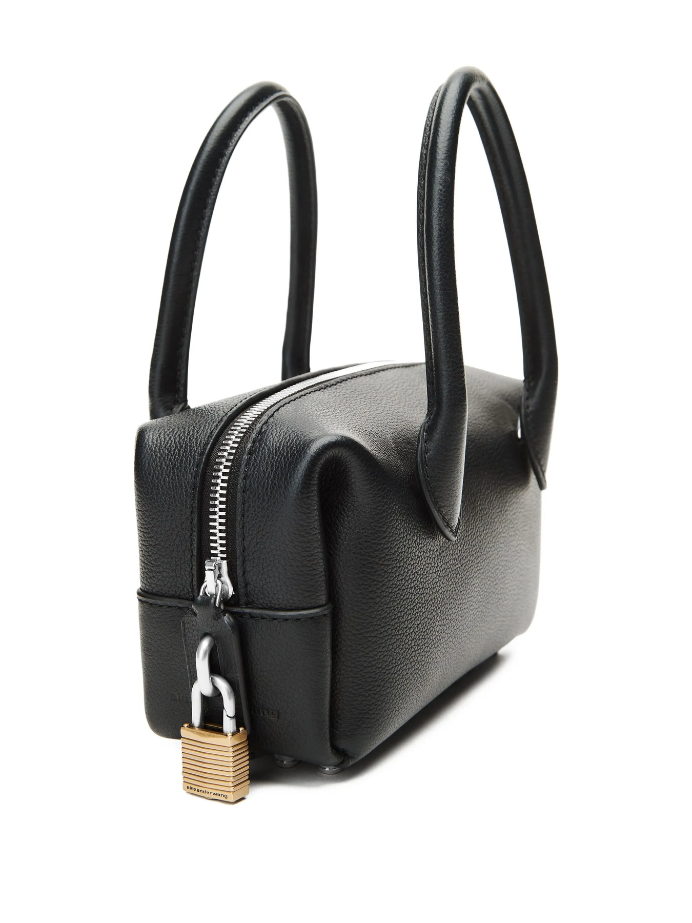 Black small grain leather top handle bag with a structured rectangular silhouette. Designed with a fixed top handle and accented by a branded key charm and padlock clip, this style is grounded by signature studs and finished with a secure top zip closure.