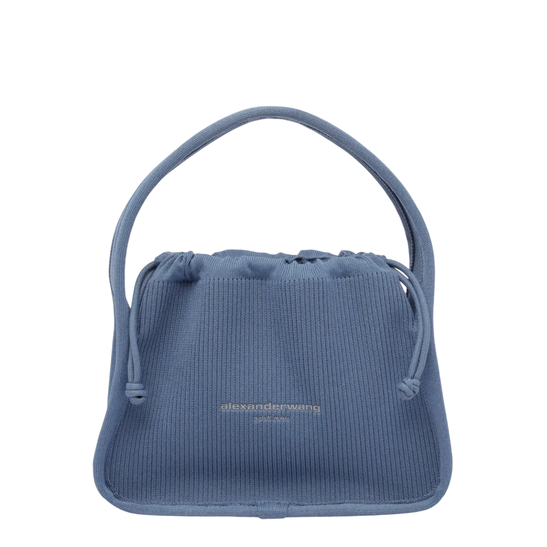The Alexander Wang Ryan Small Bag delivers contemporary minimalism with distinctive ribbed texture and drawstring functionality. Crafted from premium ribbed cotton in sophisticated blue-gray, featuring a structured circular handle and cinched opening design. The compact silhouette and signature Alexander Wang branding create a modern statement piece for everyday luxury.