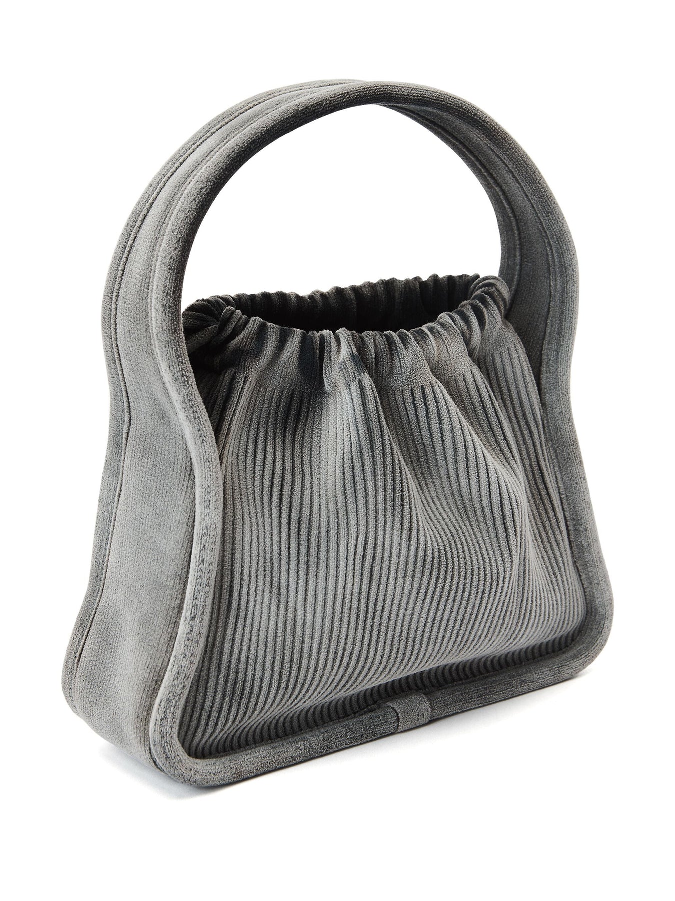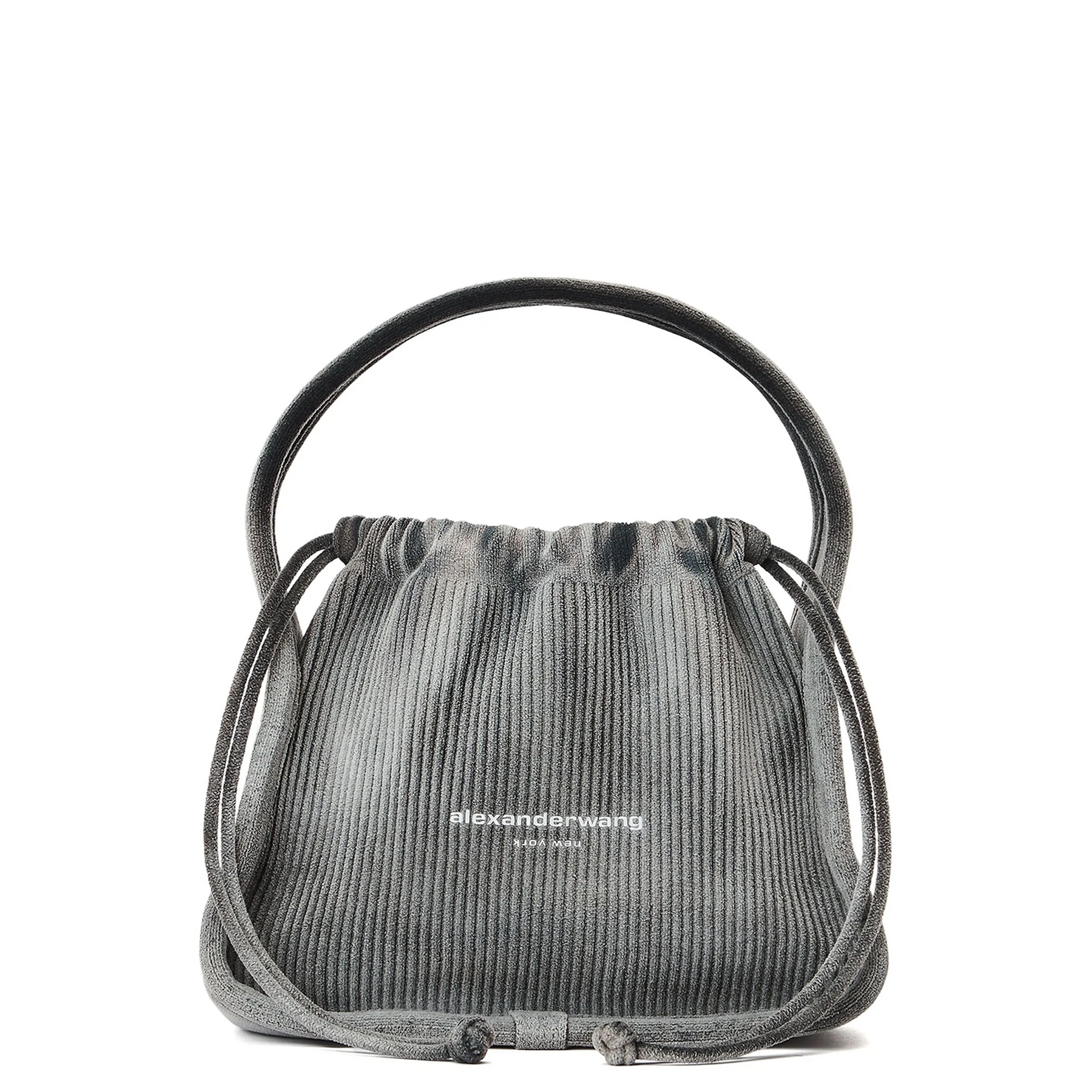 Small engineered rib knit bag in a grey wash. inspired by a dust-bag shape, this handle bag features a drawstring closure and logo at the center front.