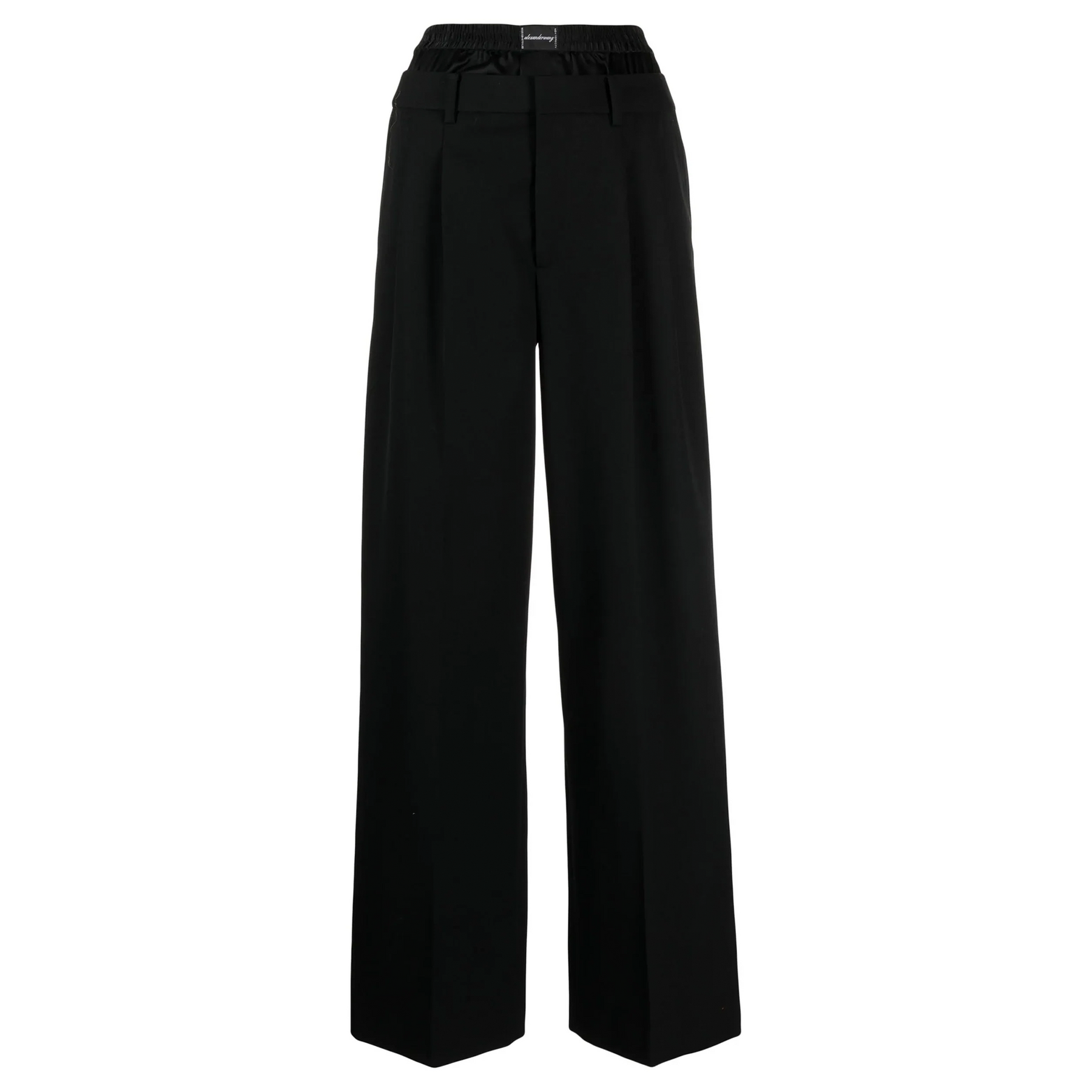 Alexander Wang seamlessly integrates streetwear elements into timeless silhouettes in his latest collection, as seen in these black wide-leg pants. Made from wool, the pants feature a layered waistband that creates the effect of exposed boxer shorts.