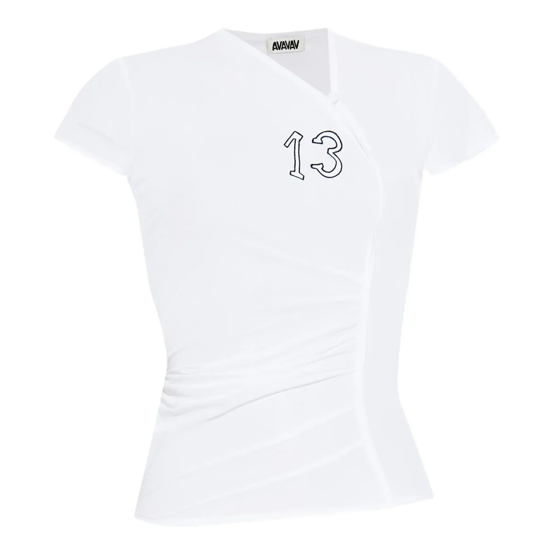 The AVAVAV Twisted T-Shirt delivers contemporary streetwear with architectural draping and avant-garde silhouette construction. Crafted from premium cotton jersey in crisp white, featuring the brand's signature twisted hemline and asymmetrical gathering detail. The innovative draping technique and number 13 graphic create a distinctive statement piece that challenges traditional t-shirt design.