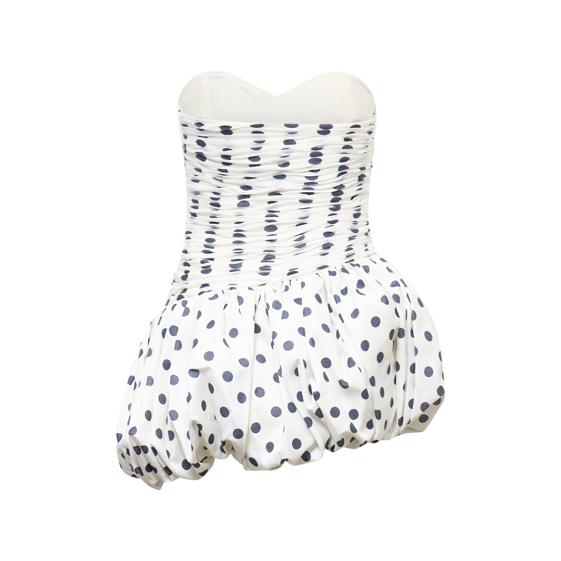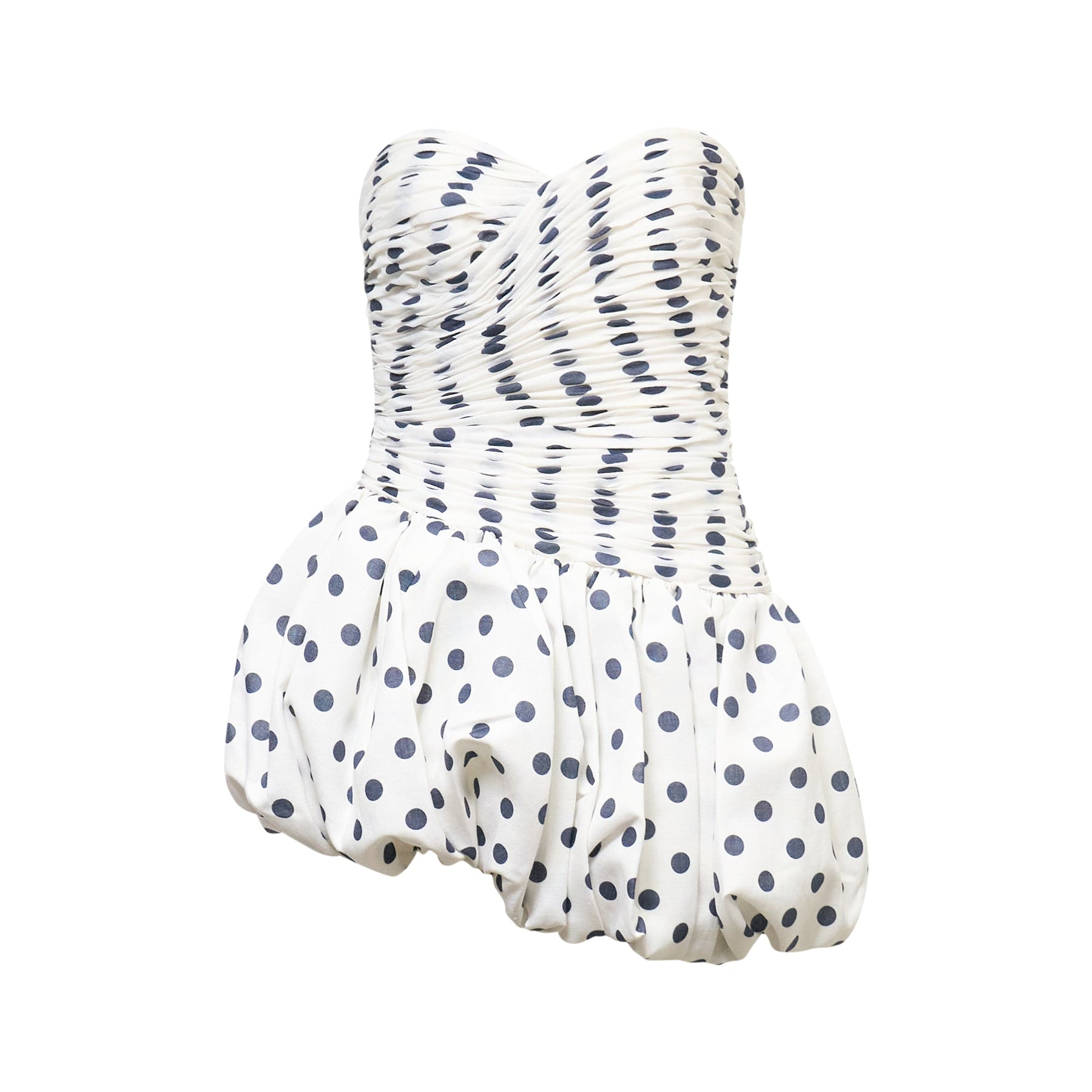 The Stolen Stores Balloon Draped Mini Dress delivers contemporary femininity with sculptural silhouette and playful sophistication. Crafted from lightweight woven fabric in classic white with navy polka dot print, featuring draped detailing that creates romantic volume. The strapless sweetheart neckline and balloon-shaped skirt offer a modern take on vintage-inspired design.