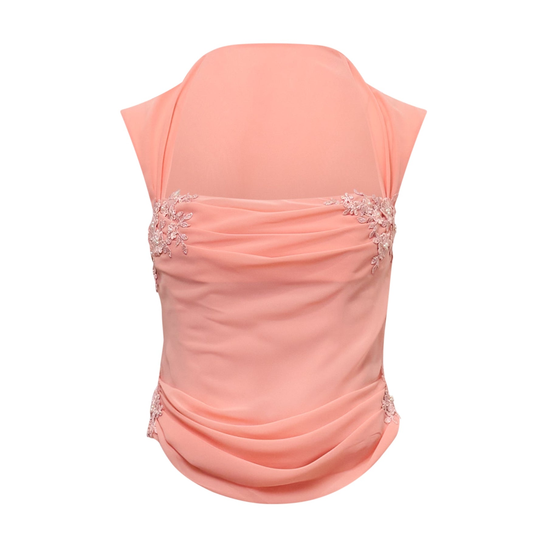 The Stolen Stores Belle Draped Lace Corset delivers romantic femininity with structured silhouette and delicate craftsmanship. Crafted from soft coral-toned fabric with intricate lace appliqué detailing and artful draping that creates a flattering fitted shape. The elegant shoulder coverage and decorative lace elements make this a sophisticated statement piece for special occasions.