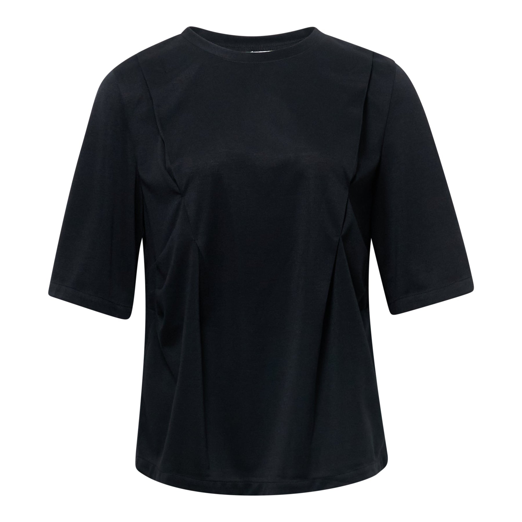 KUMANN YHJ Black Ponte T-Shirt delivers contemporary minimalism with structured ponte fabric construction. Made from premium ponte knit in classic black, featuring three-quarter sleeves and a relaxed oversized silhouette. The smooth, structured fabric provides shape retention and sophisticated drape for elevated everyday wear.
