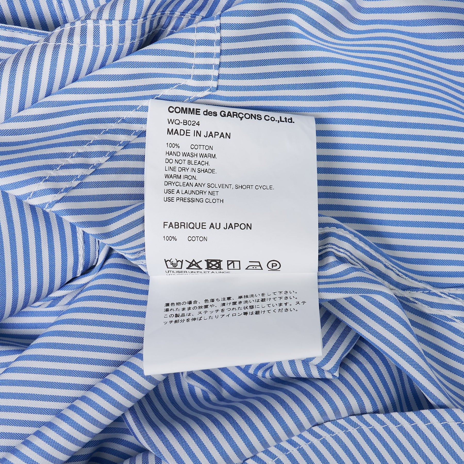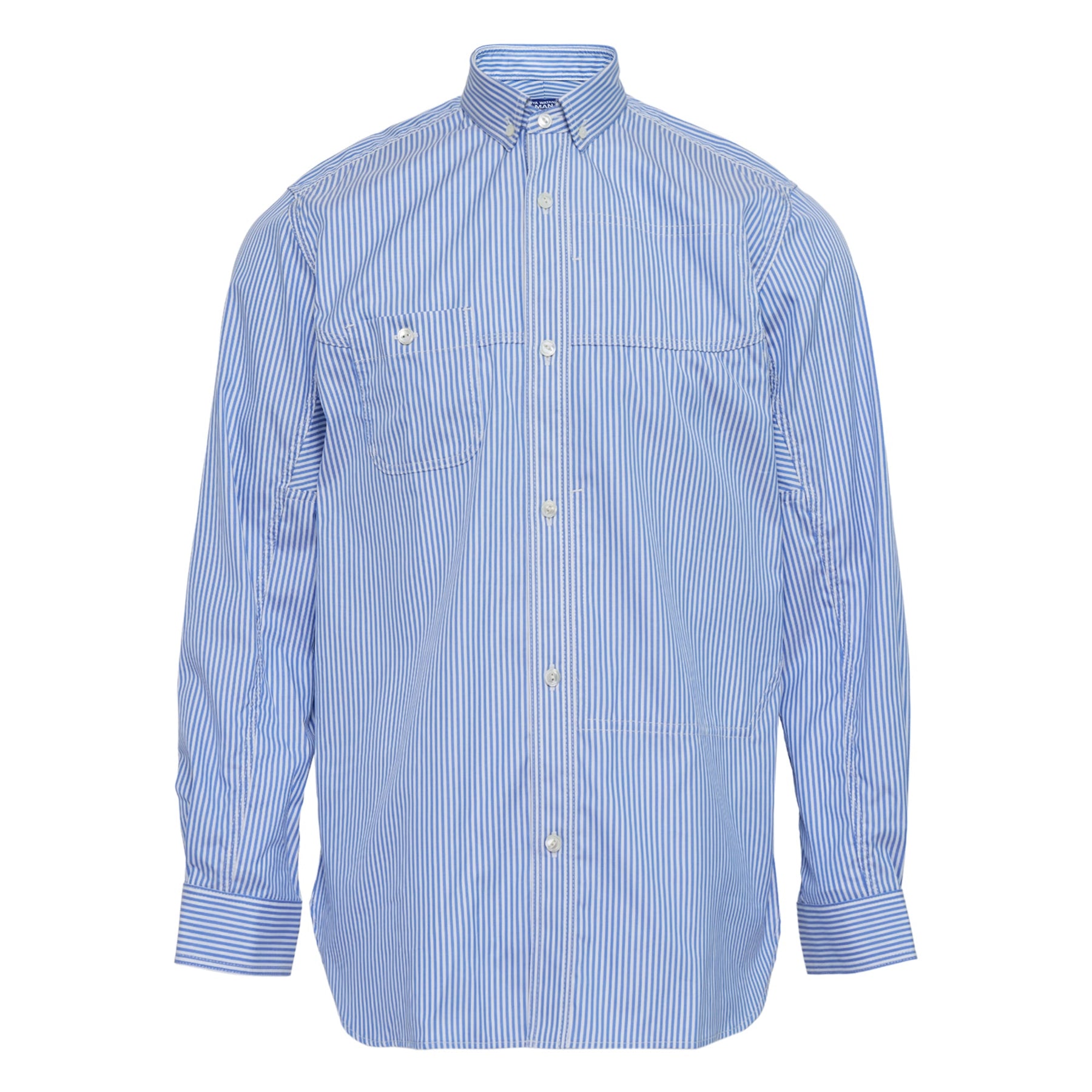 Junya Watanabe Blue Cotton Strip Button-Up delivers refined minimalism with architectural precision and modern tailoring. Crafted from premium cotton with vertical blue and white stripes, featuring clean construction and structured silhouette. The classic collar design and streamlined fit create a versatile foundation piece for contemporary wardrobes.