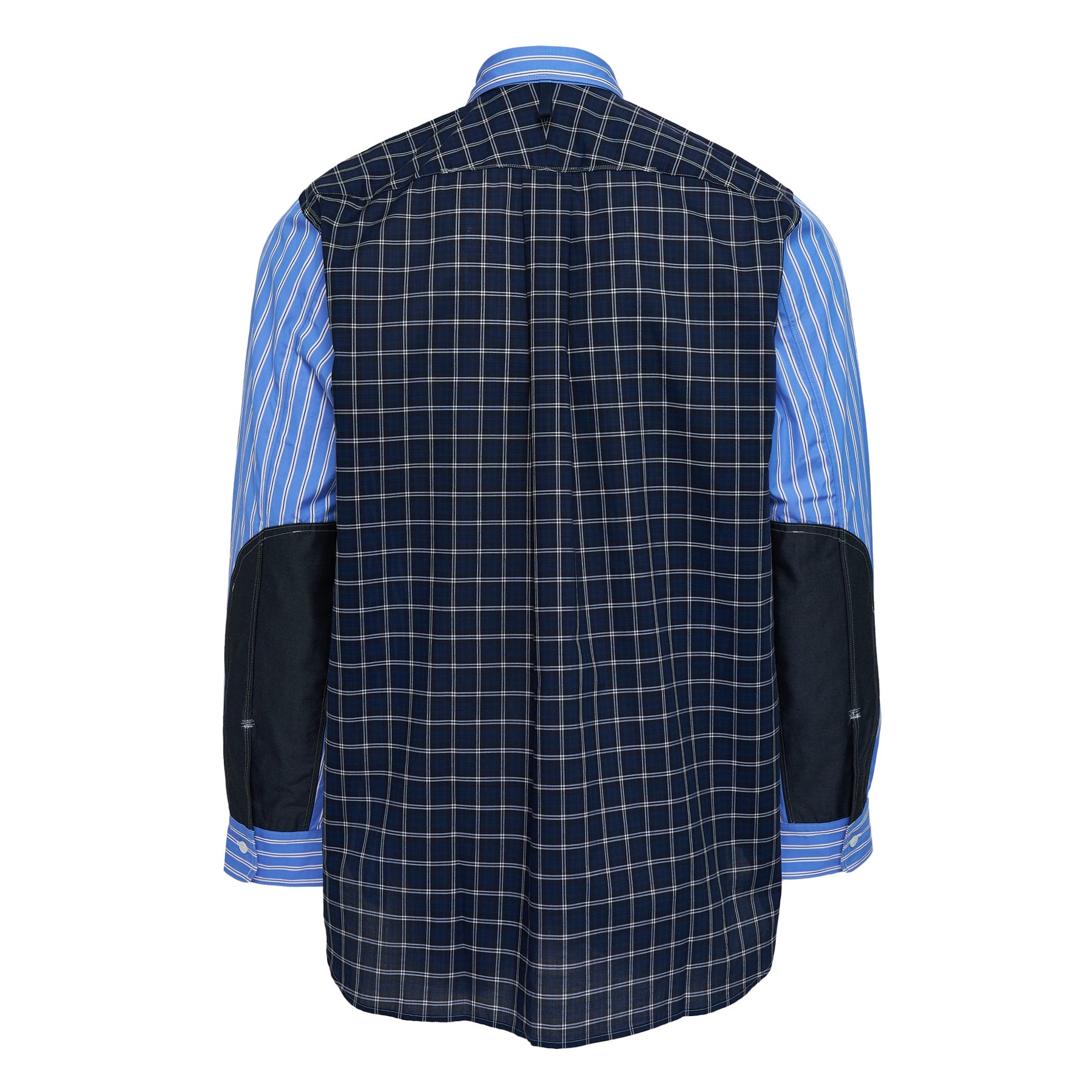 Junya Watanabe Blue Cotton Stripe Check Shirt delivers innovative pattern mixing with traditional shirting craftsmanship. Constructed from premium cotton featuring contrasting blue pinstripes on the body with black check shoulder panels for architectural visual interest. The hybrid design showcases Watanabe's signature deconstructed approach to classic menswear silhouettes.