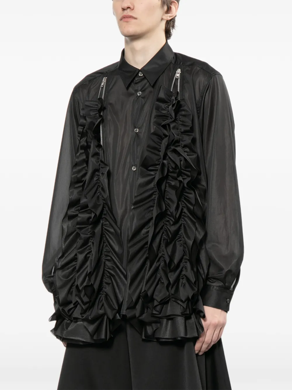 COMME des GARCONS HOMME PLUS Bold Panel Shirt delivers avant-garde construction with innovative zip detailing and architectural silhouette. Crafted from premium cotton with contrast panel construction, featuring exposed silver-tone zippers and the brand's signature deconstructed aesthetic. The asymmetrical hemline and oversized fit create a bold statement piece that embodies the label's experimental design philosophy.