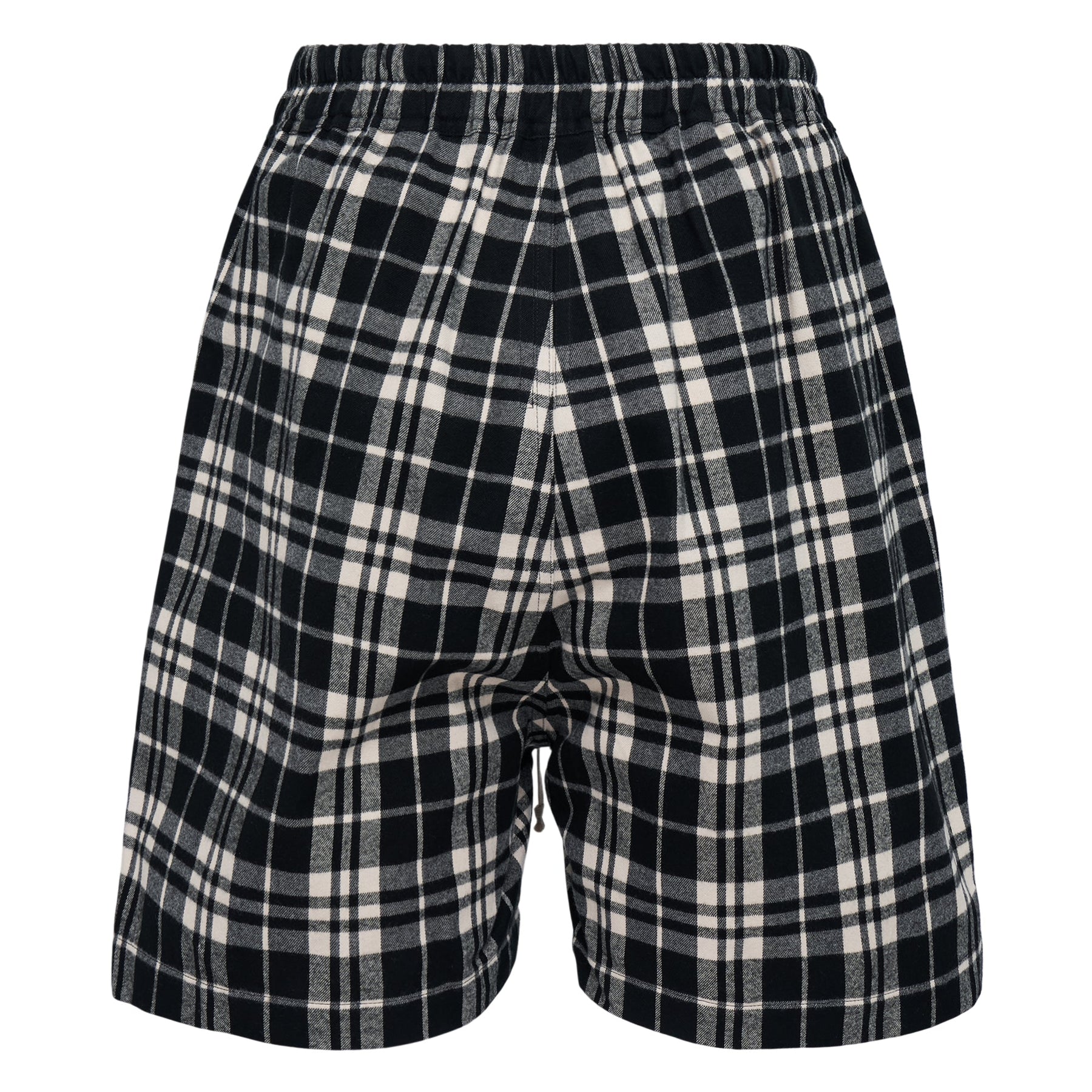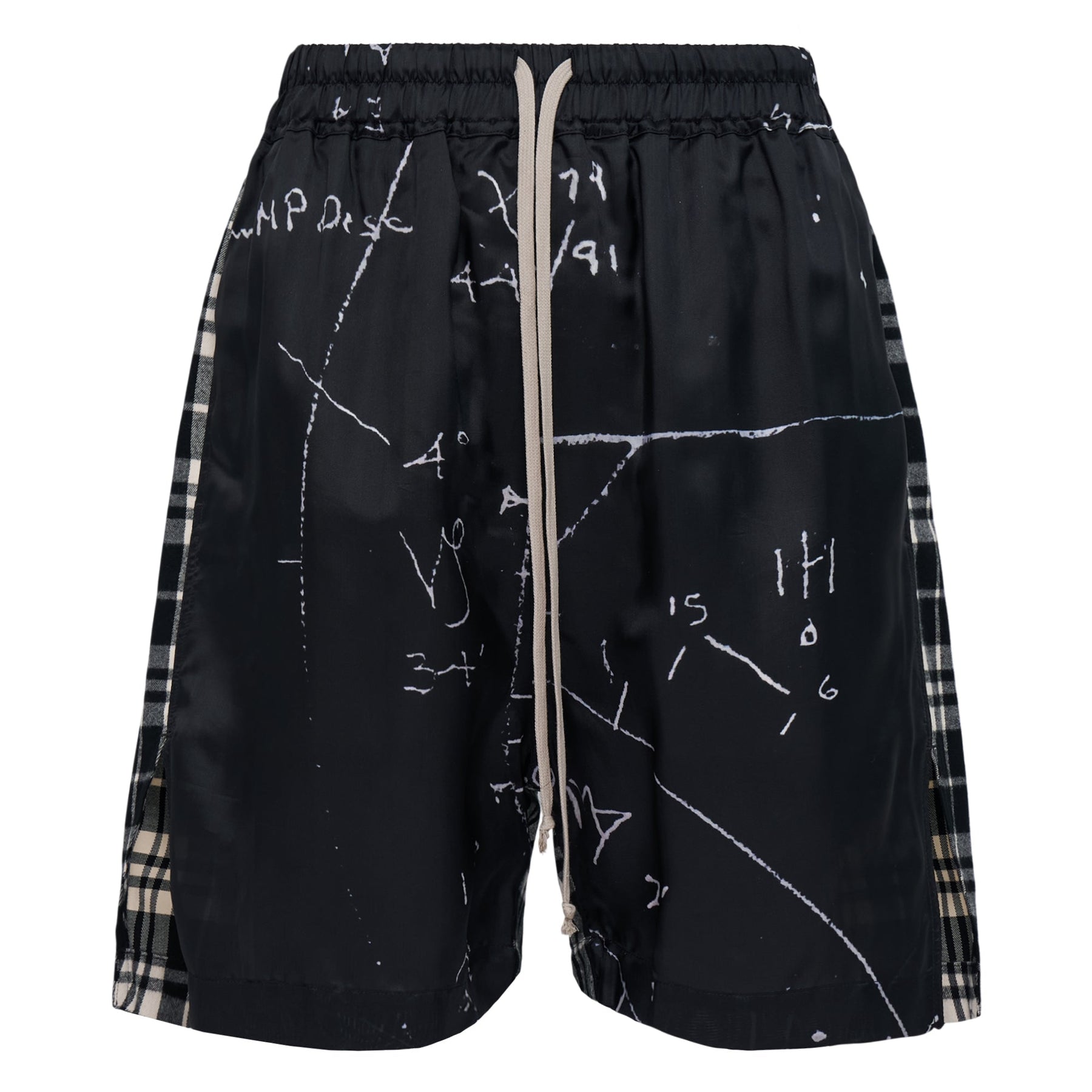 Rick Owens Boxer Printed Cupro Twill Shorts deliver avant-garde streetwear with artistic graffiti-inspired graphics and premium construction. Crafted from lightweight cupro twill in black with contrasting plaid panel inserts and hand-drawn white chalk markings throughout. The relaxed boxer silhouette and signature DRKSHDW aesthetic create a bold statement piece for contemporary wardrobes.