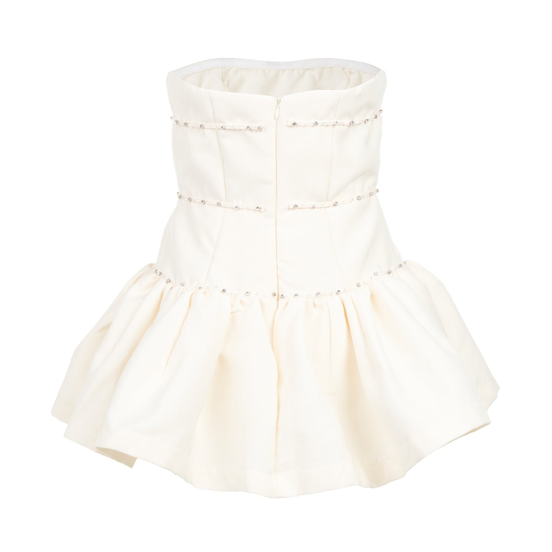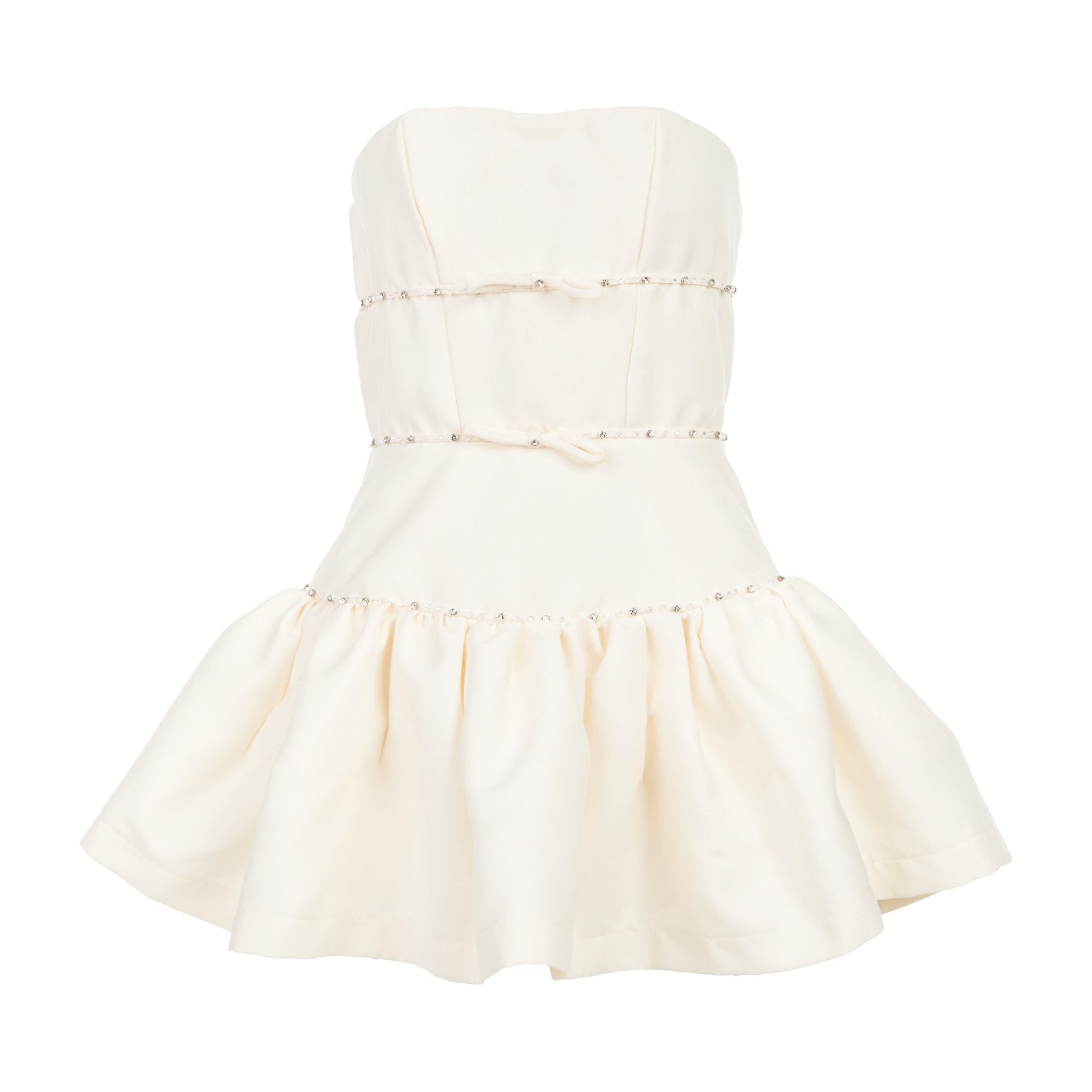 The Kenzie Klambie Bubble Ribbon Dress delivers romantic femininity with strapless silhouette and tiered construction. Crafted from lightweight cream fabric with delicate ribbon trim detailing throughout each tier, creating textural depth and movement. The fitted bodice and voluminous bubble hem create a playful yet sophisticated statement piece perfect for special occasions.