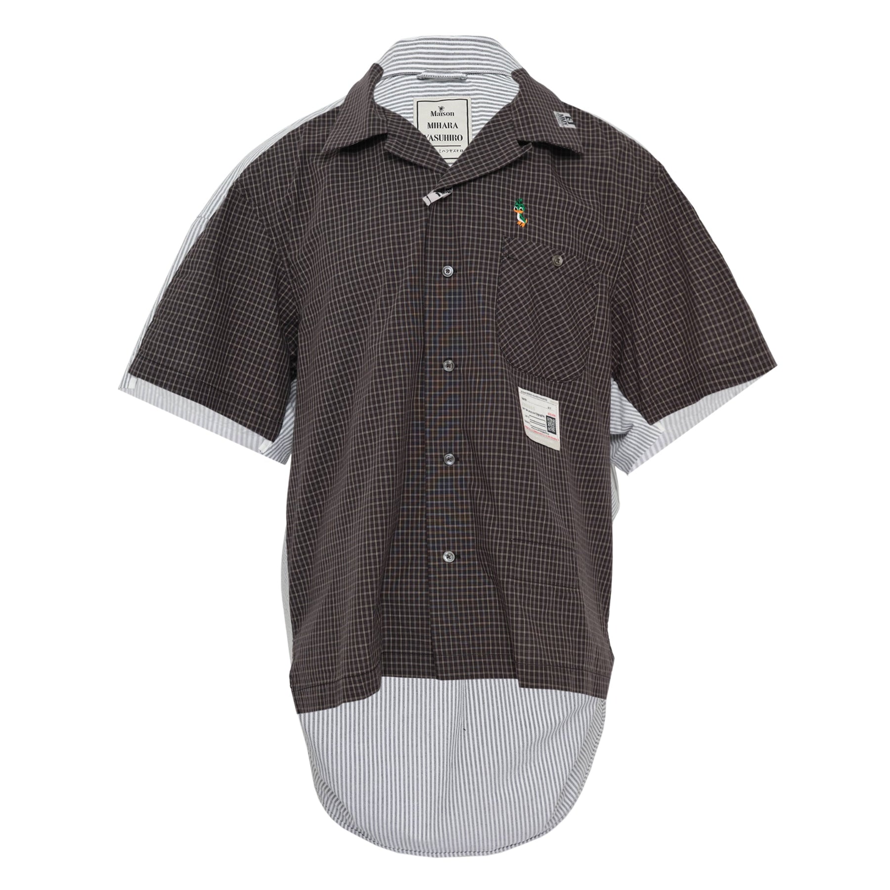 MIHARA YASUHIRO Combined Shirts x Shirts delivers innovative layered construction with avant-garde Japanese design. Crafted from premium cotton blend featuring a dark check pattern over contrasting pinstriped underlayer with extended hem detail. The deconstructed silhouette and signature asymmetric styling create a bold statement piece for contemporary wardrobes.