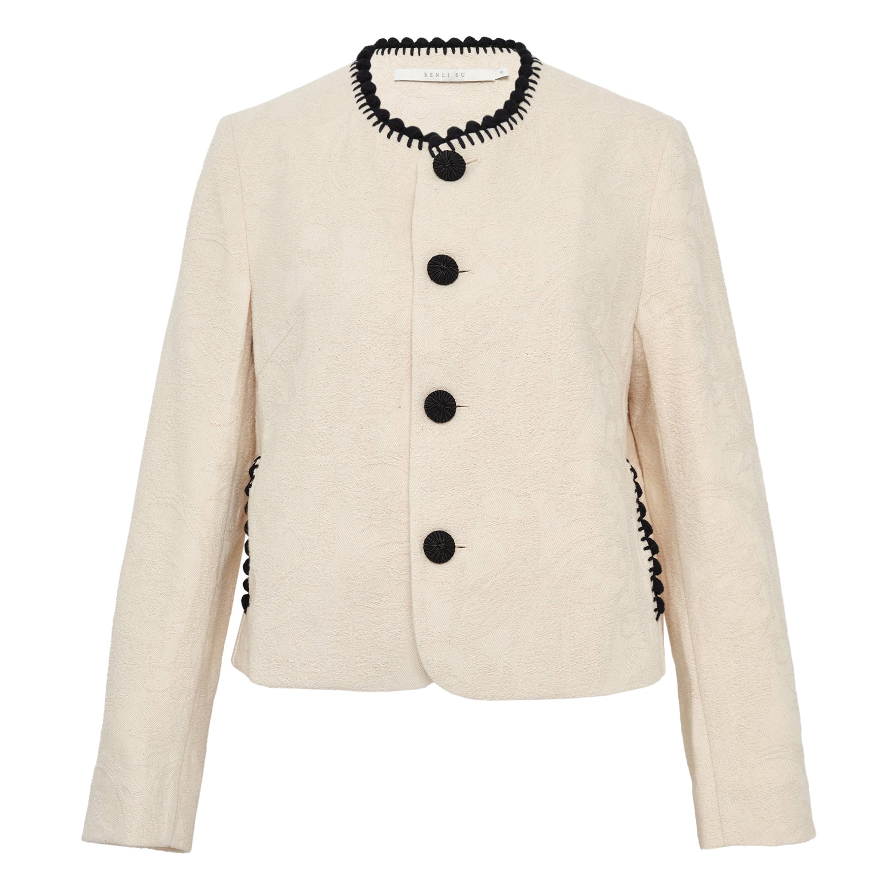 The Renli Su Contrast Trim Cropped Jacket delivers contemporary tailoring with sophisticated design details and modern silhouette. Crafted from premium cream wool blend fabric with contrasting black trim detailing around the collar and side seams. The cropped length and statement button details create a refined piece perfect for elevating professional and evening wardrobes.