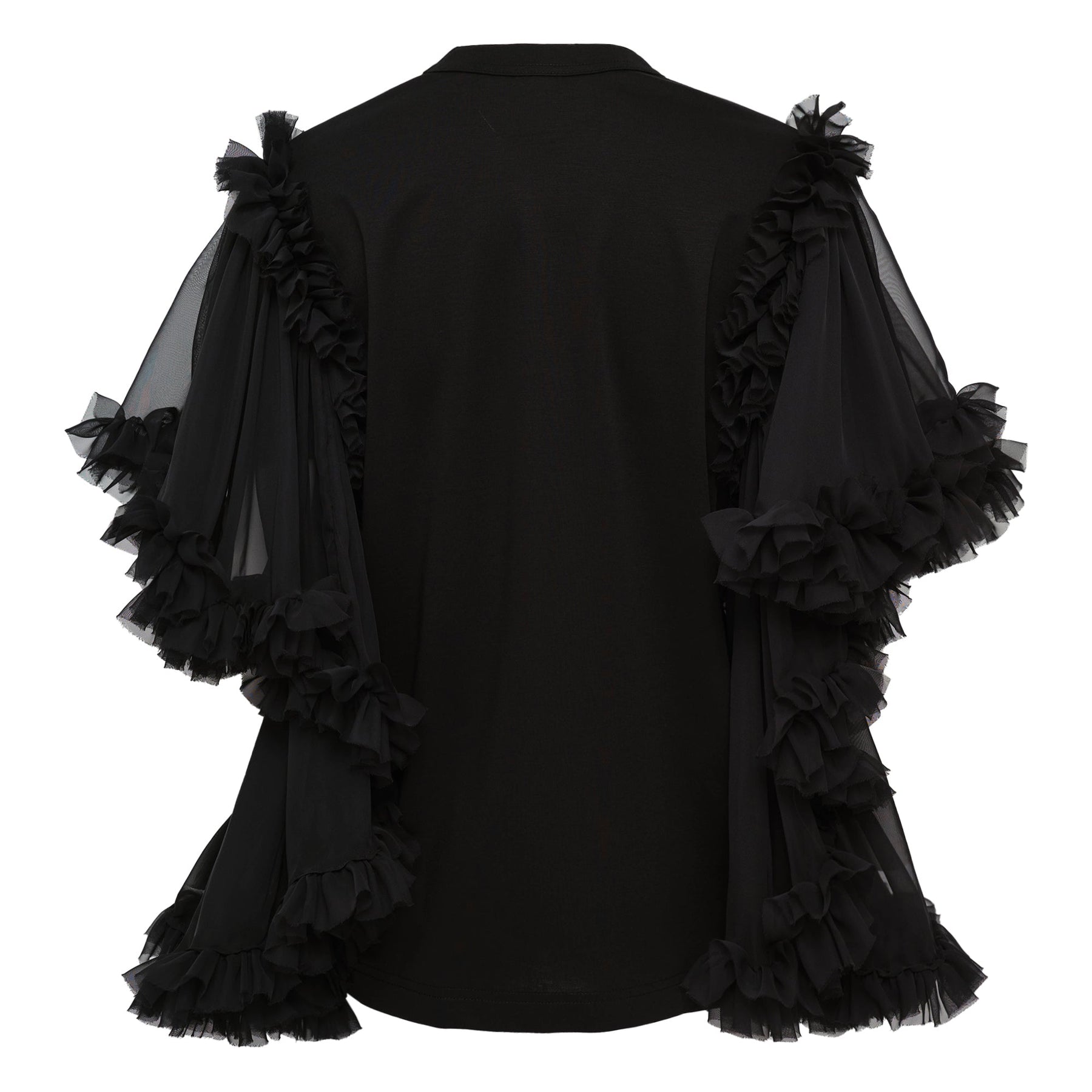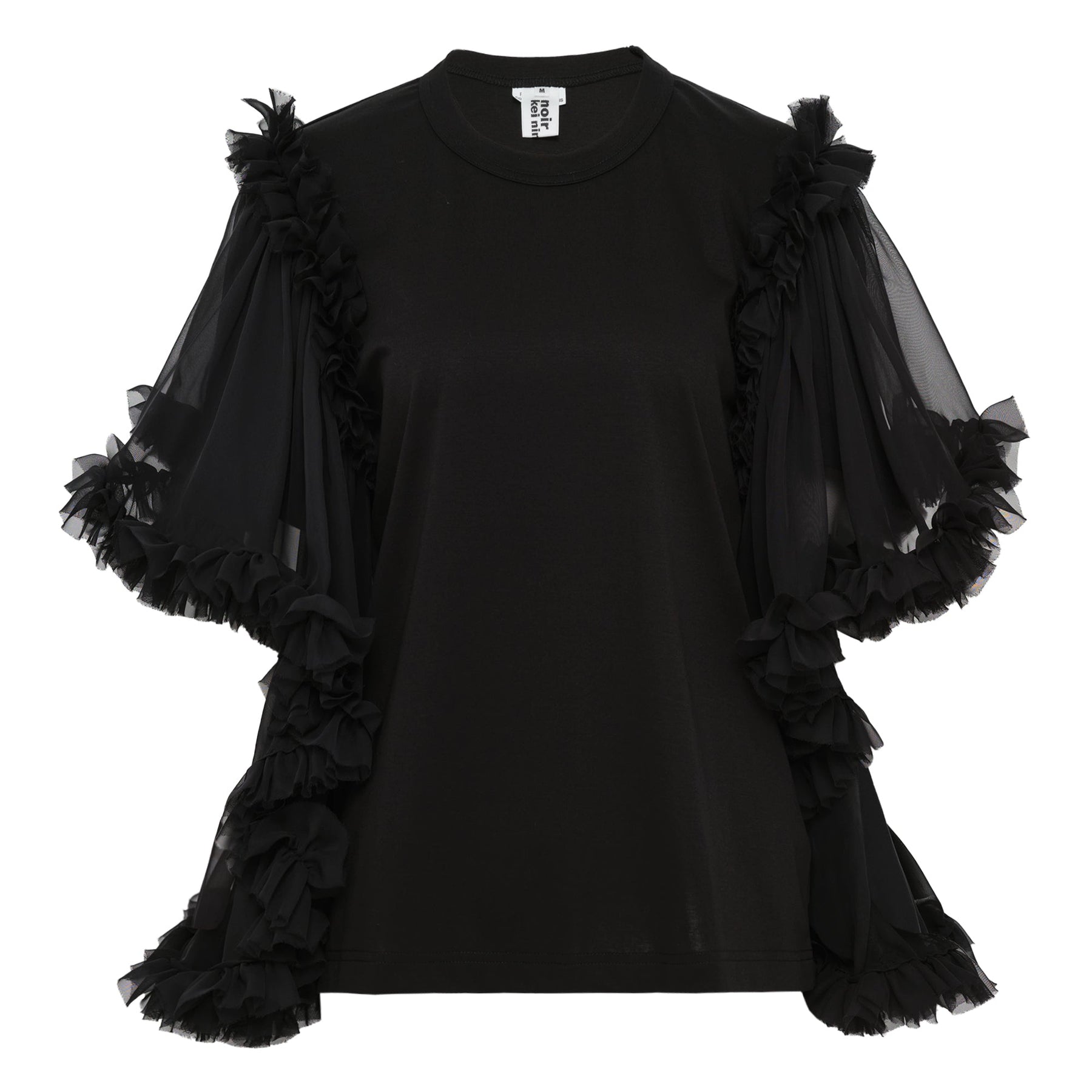Noir Kei Ninomiya Cotton Ponte x Polyester Georg Tee delivers avant-garde femininity with dramatic tulle detailing and architectural construction. Crafted from a sophisticated blend of structured cotton ponte jersey and flowing polyester georgette, featuring cascading tulle ruffles across the sleeves and shoulders. The contrast between the fitted base and voluminous tulle elements creates Noir Kei Ninomiya's signature deconstructed aesthetic.