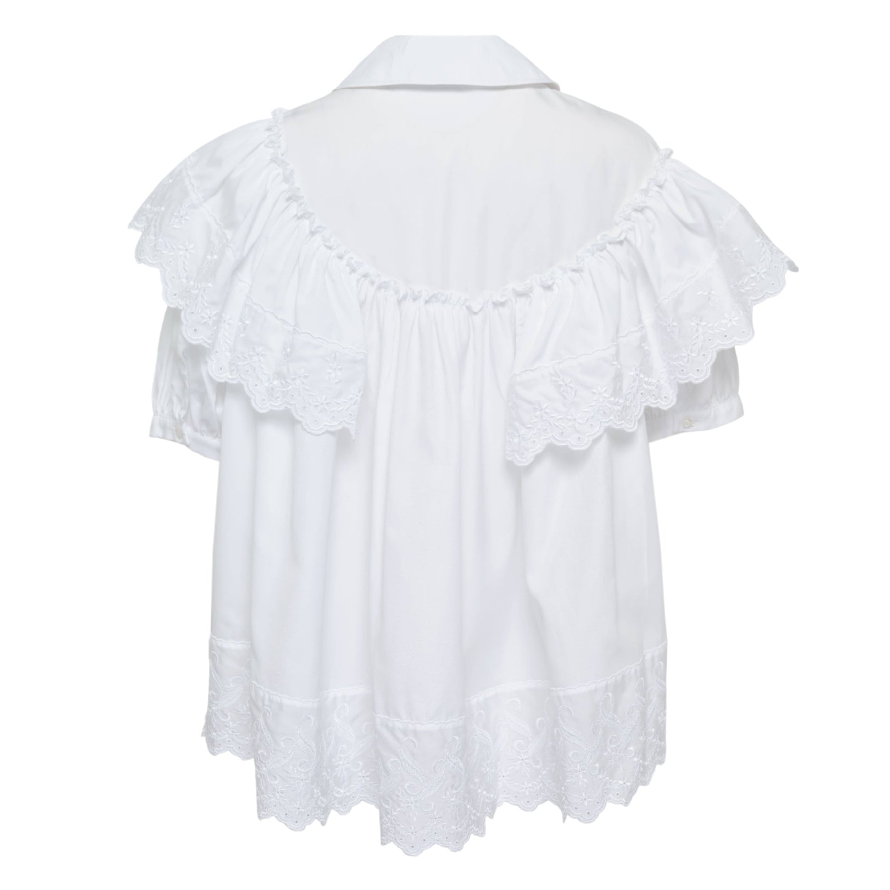 The Simone Rocha Cropped Puff Sleeve Ruffle Blouse delivers romantic femininity with signature architectural construction and dramatic proportions. Crafted from crisp white cotton with intricate eyelet embroidery and tiered ruffles throughout, featuring pearl-detailed collar trim and voluminous sleeves. The brand's distinctive blend of Victorian romanticism and contemporary silhouette creates an elevated statement piece for modern wardrobes.