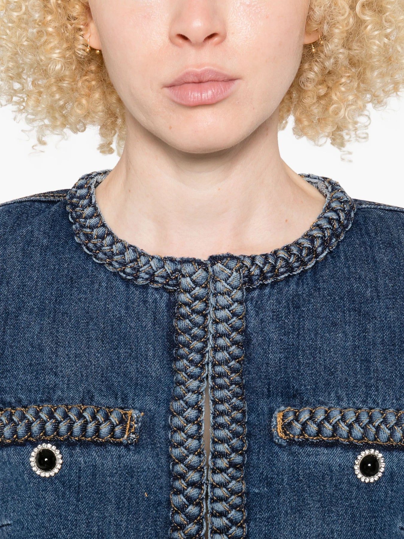 Self-Portrait Denim Braided Jacket delivers contemporary femininity with intricate braided detailing and sophisticated tailoring. Crafted from premium indigo denim with metallic braided trim around the neckline, pockets, and cuffs, creating an elevated take on casual denim. The cropped silhouette and elegant braided accents transform classic denim into a statement piece perfect for modern wardrobes.