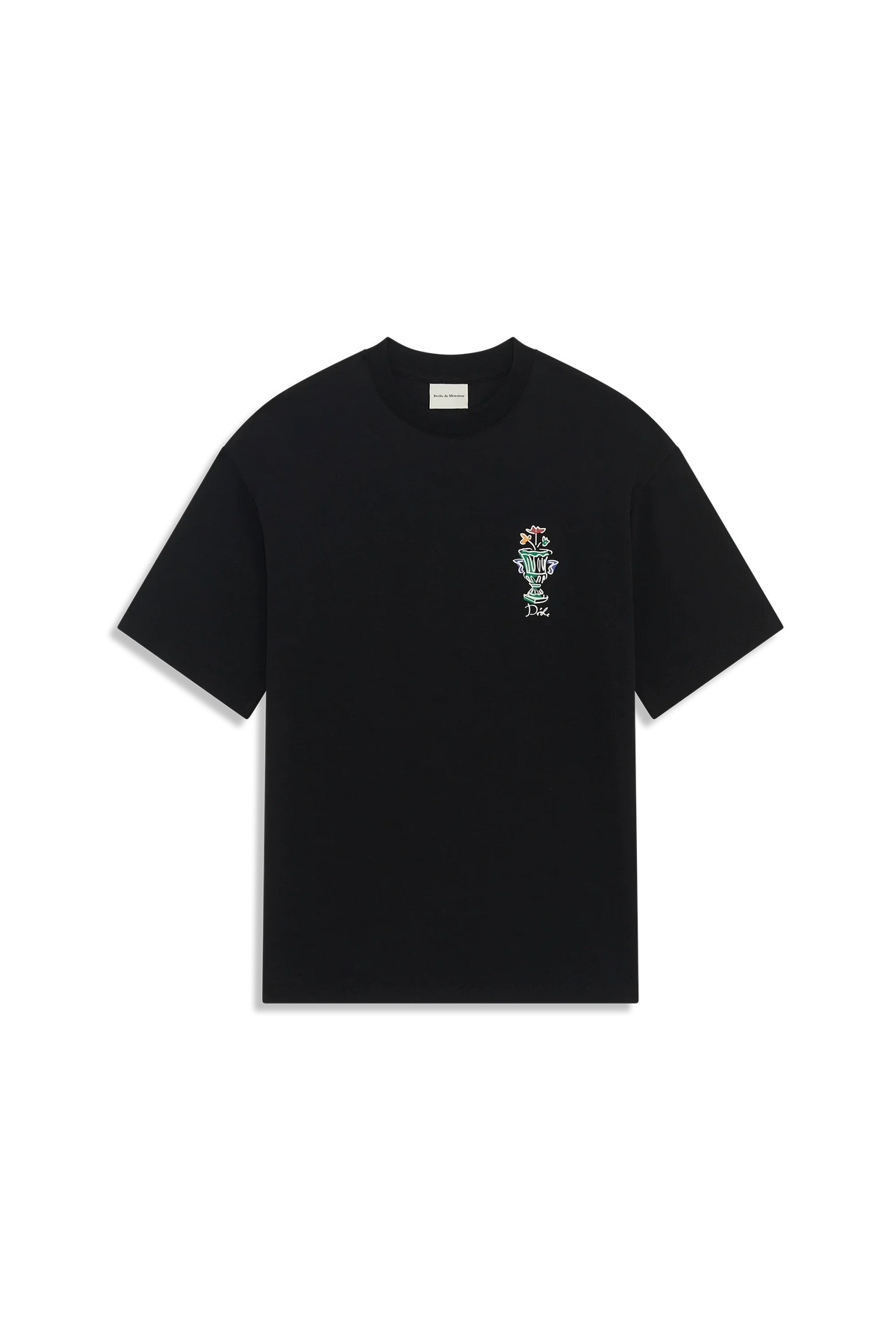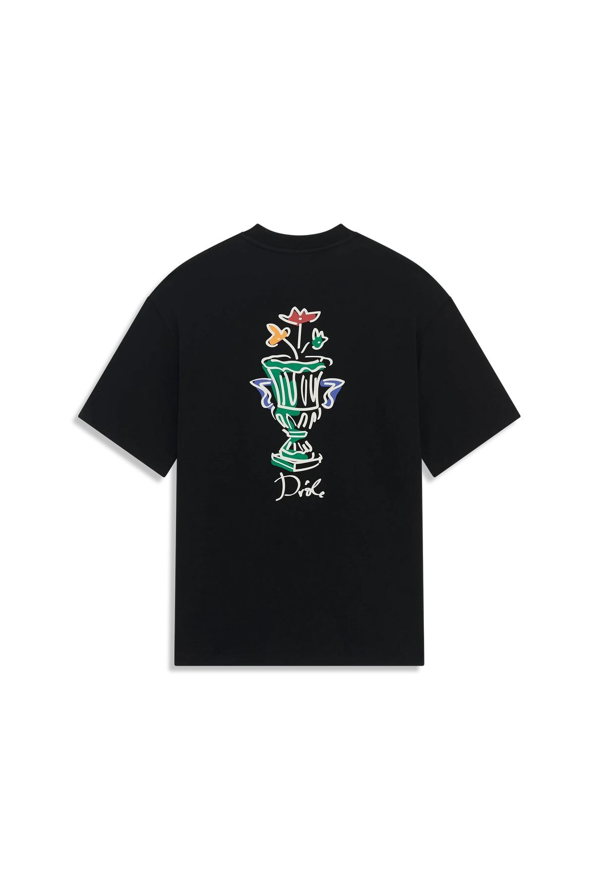 This black 100% cotton interlock t-shirt with a ribbed neckline features the Vase print on the front and back.