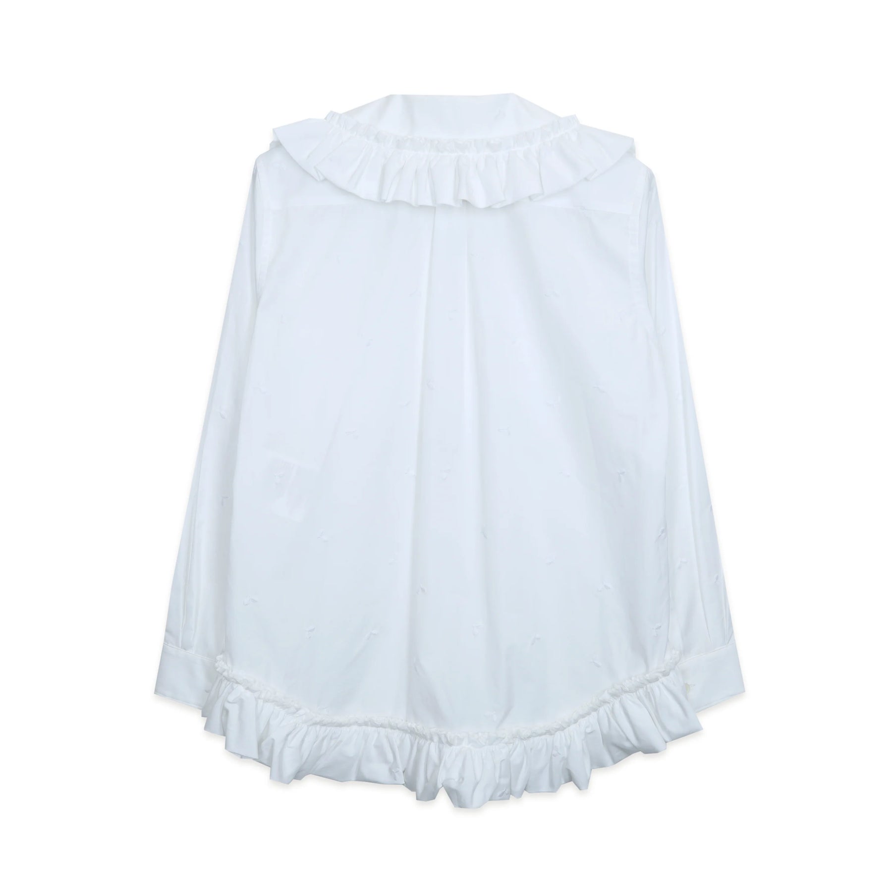 COMME des GARCONS GIRL Embroidery Leaf Pattern Blouse delivers avant-garde femininity with intricate botanical detailing and Japanese craftsmanship. Crafted from crisp white cotton featuring delicate ruffled collar and hem trim, creating textural contrast against the clean silhouette. The signature CDG GIRL aesthetic combines playful sophistication with contemporary edge for modern wardrobes.