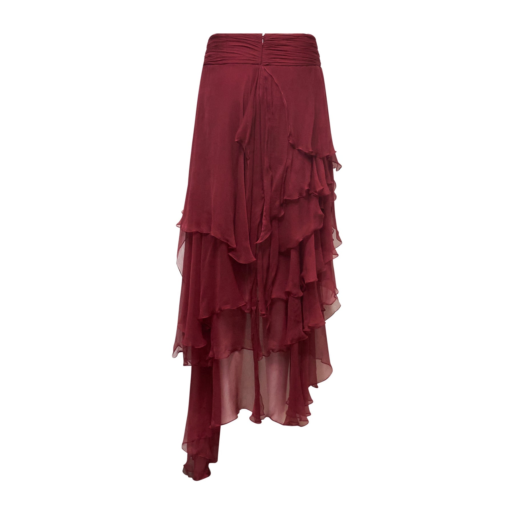 The Stolen Stores Fairy Layered Maxi Skirt delivers romantic elegance with dramatic tiered construction and flowing movement. Crafted from lightweight chiffon fabric in deep burgundy wine, featuring multiple cascading ruffle layers and an asymmetrical hemline. The elasticated waistband and ethereal silhouette create a statement piece perfect for special occasions and evening wear.