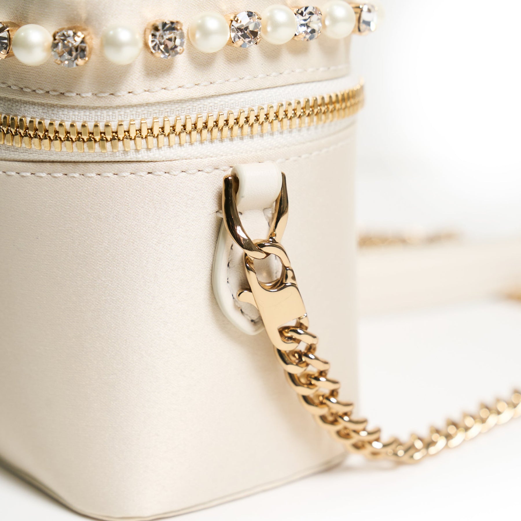 The Stella McCartney Falabella Vanity Case delivers iconic luxury with sustainable craftsmanship and signature chain detailing. Crafted from eco-friendly satin in pristine cream, featuring pearl and crystal embellishments with gold-tone hardware throughout. The structured vanity case silhouette and signature Falabella chain create a statement piece that reflects the brand's commitment to ethical luxury.