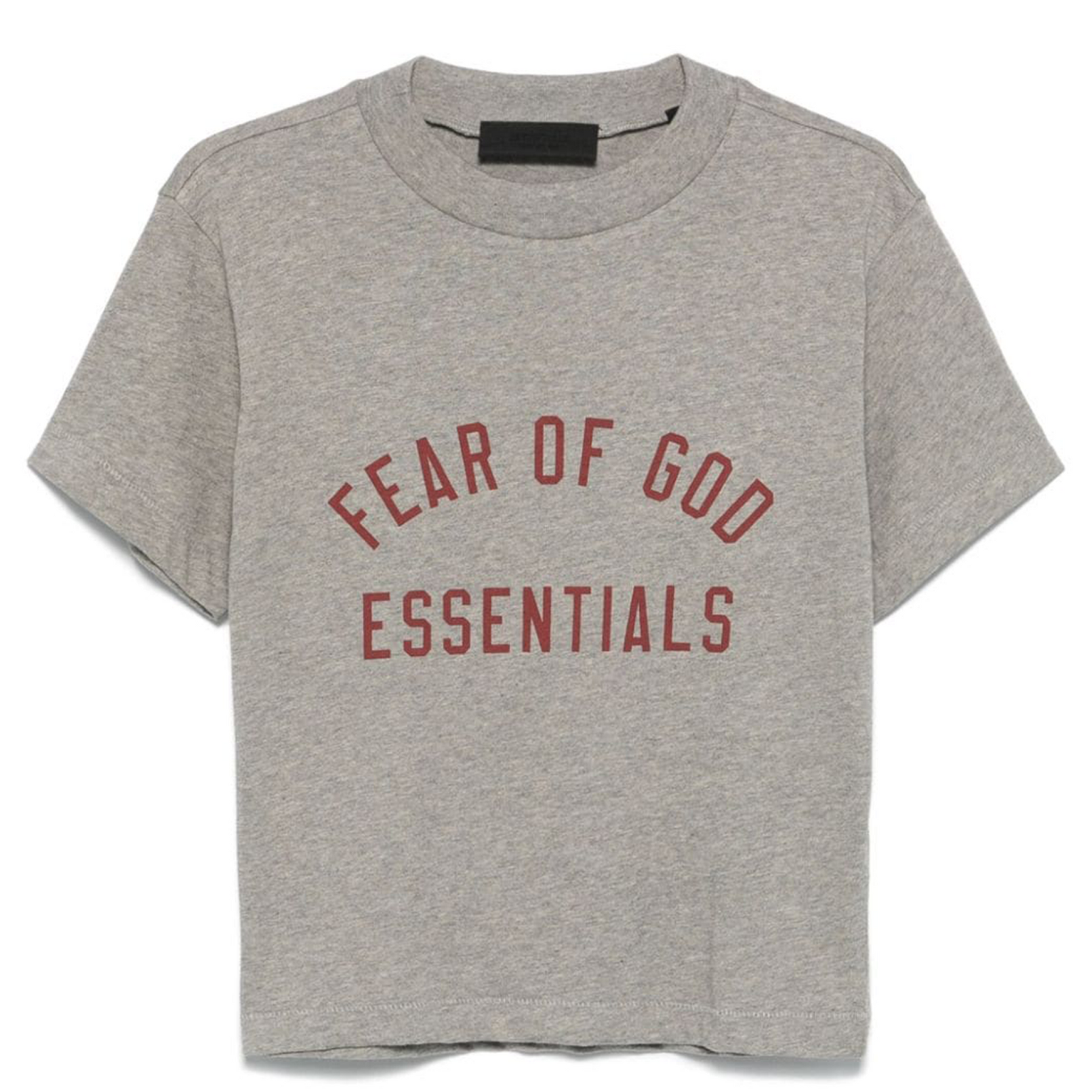 The women's Essentials T-shirt is made from a tri-blend knit fabric, offering a softer feel. It features a ribbed knit crewneck and a cropped, relaxed fit. The front branded with a "Fear of God Essentials " collegiate graphic screen print, and the back collar has a stitched Essentials Fear of God rubberized label.