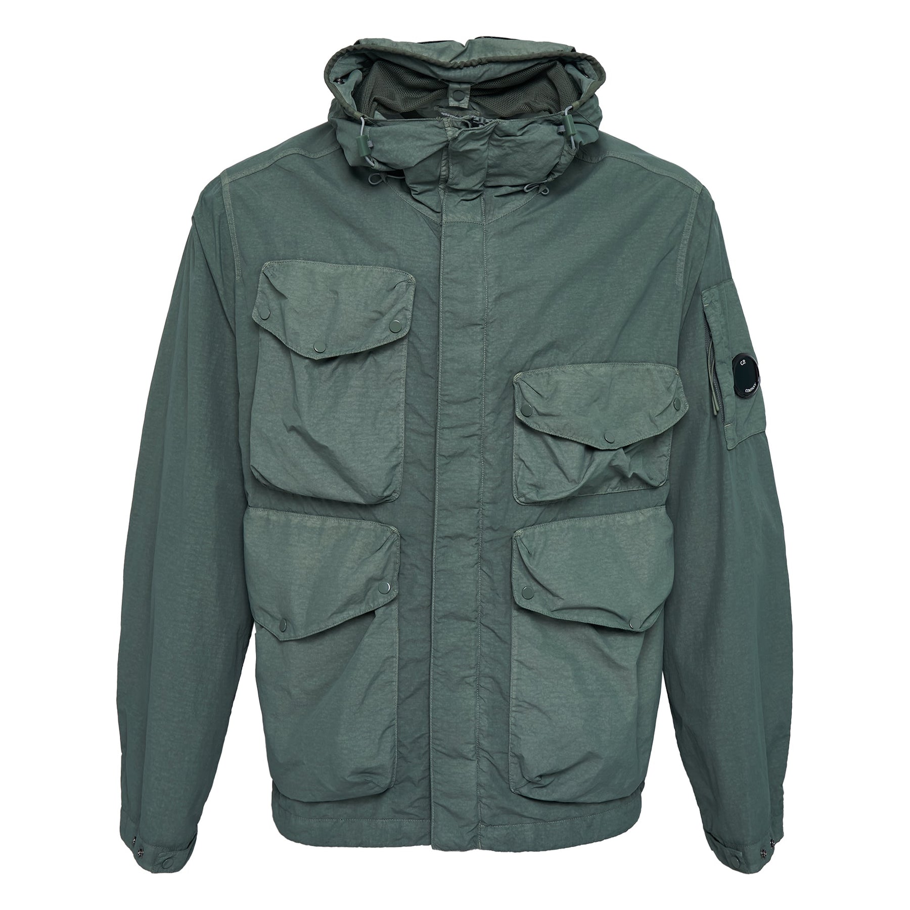 The C.P. Company Flatt Nylon Goggle Jacket delivers innovative Italian design with the brand's signature removable goggle hood system. Crafted from lightweight technical nylon in sage green, featuring four large cargo pockets and water-resistant construction. The iconic goggle hood and military-inspired silhouette create a distinctive streetwear statement piece.