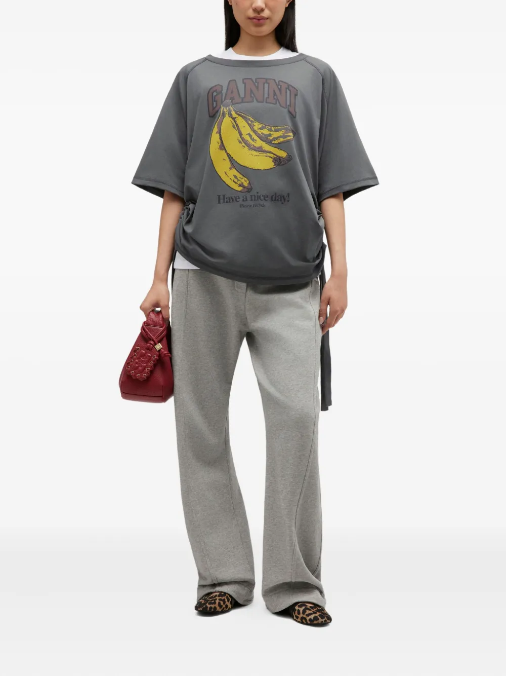 GANNI Future Heavy Jersey Raglan delivers contemporary Scandinavian style with sustainable comfort and playful graphic elements. Crafted from premium heavy jersey cotton in khaki green, featuring signature banana print graphics and adjustable side ties for customizable fit. The relaxed raglan sleeves and environmental messaging reflect the brand's commitment to conscious fashion and Danish design heritage.