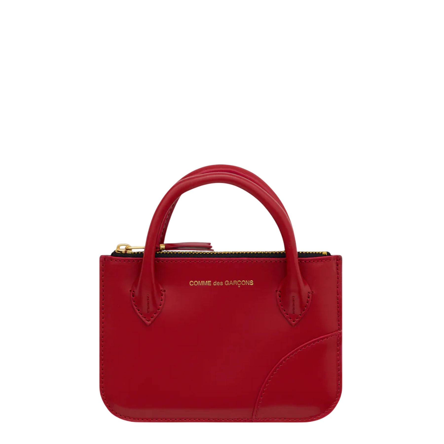 COMME des GARCONS Handels-Coin Pouch delivers minimalist functionality with avant-garde design sensibility. Crafted from premium smooth leather in vibrant red, featuring dual top handles and signature gold-tone branding. The compact structured silhouette and zip closure create an essential accessory for contemporary organization.