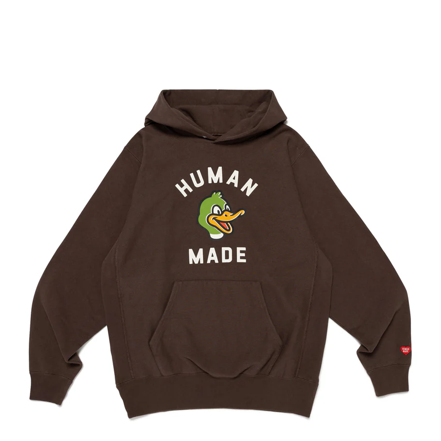 The Human Made Heavyweight Hoodie delivers premium Japanese streetwear with signature duck mascot branding and superior construction. Crafted from heavyweight cotton fleece in rich brown, featuring the iconic cartoon duck graphic and bold 'HUMAN MADE' lettering across the chest. The oversized fit and premium weight create a statement piece that embodies Nigo's playful yet refined aesthetic.