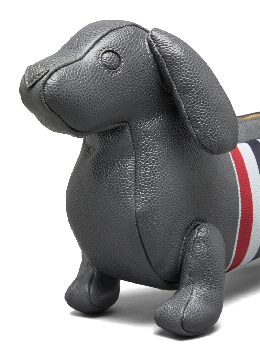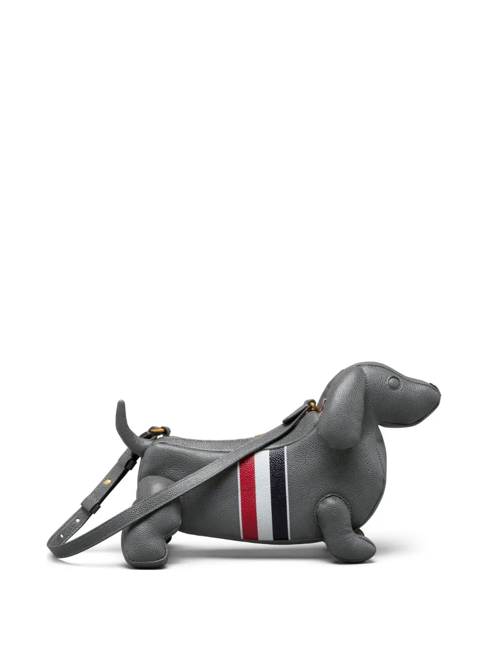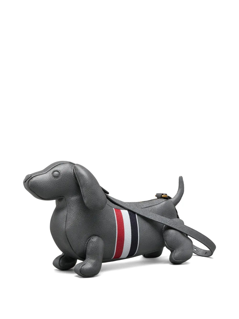 The Thom Browne Hector Baguette Bag delivers whimsical luxury with the brand's iconic dachshund silhouette and signature craftsmanship. Crafted from premium pebbled leather in sophisticated gray with the classic red, white and blue striping detail across the body. The playful yet refined design transforms the beloved brand mascot into a functional statement accessory.