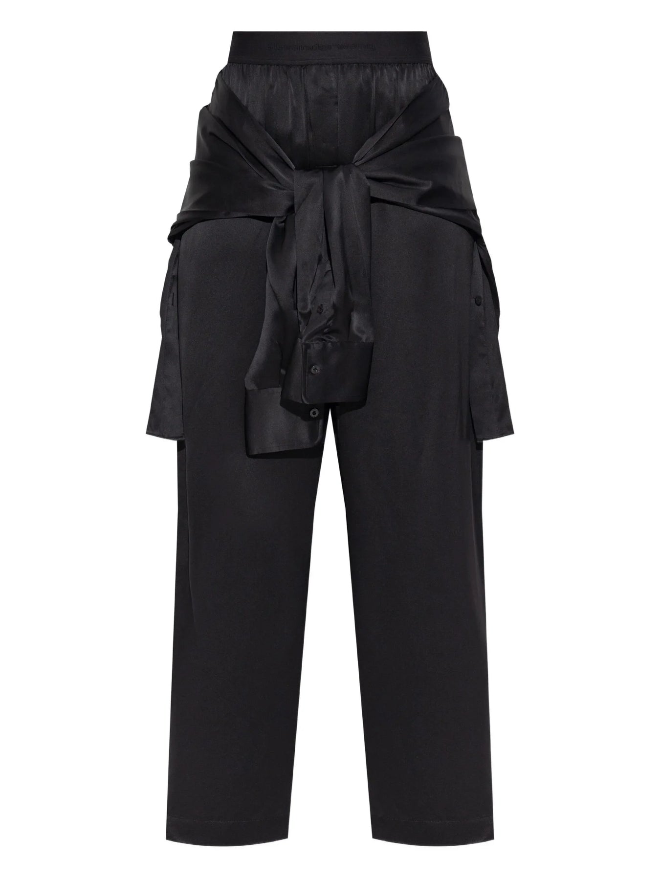 Alexander Wang High Rise Boxer Pant delivers contemporary tailoring with avant-garde layering details and urban sophistication. Crafted from structured black cotton with an attached wrap-around shirt element, featuring elastic waistband and relaxed boxer-inspired silhouette. The deconstructed design and signature Wang aesthetic create a statement piece that blurs the lines between formal and streetwear.