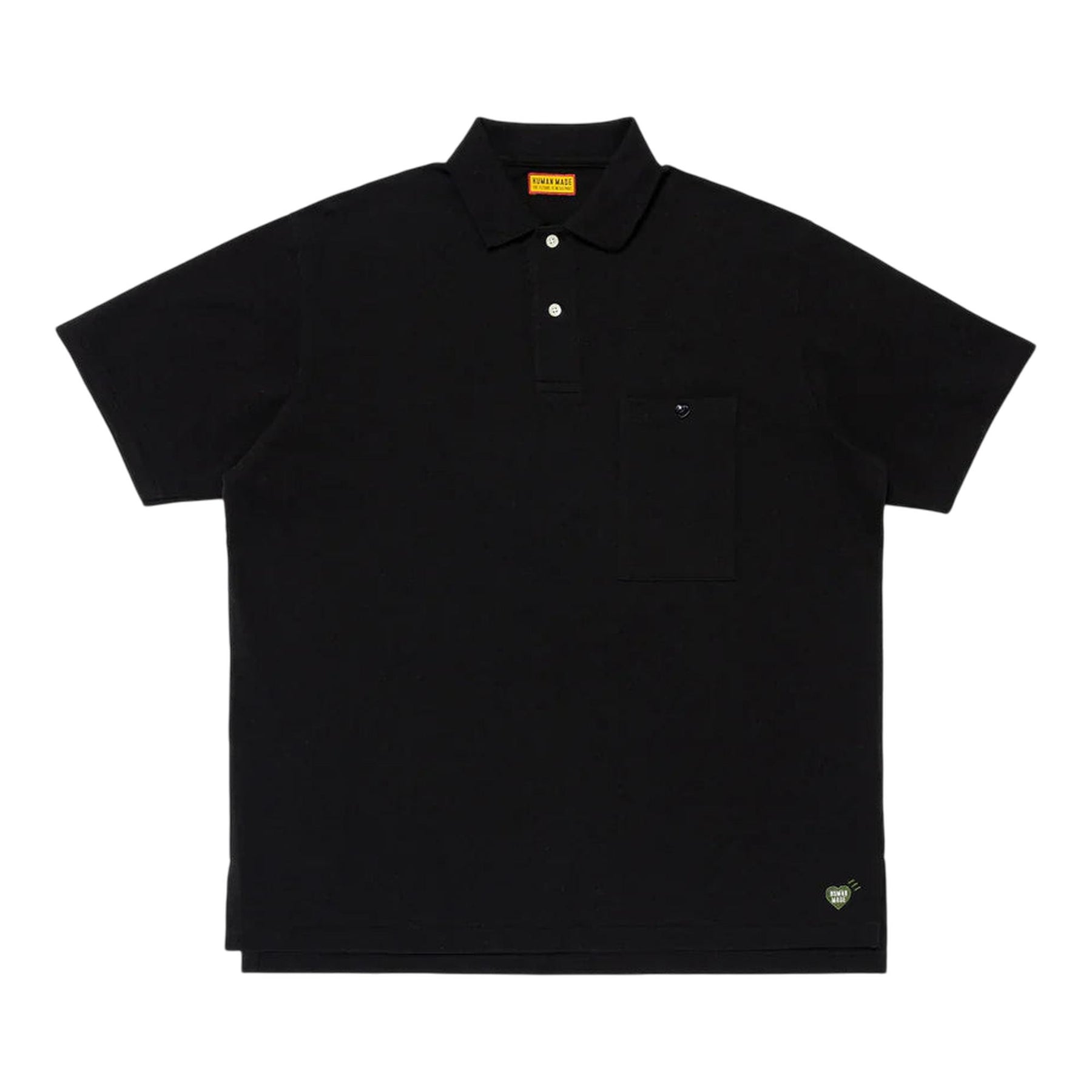 Polo shirt with a big silhouette. Details include a logo patch and a pocket on the left chest.