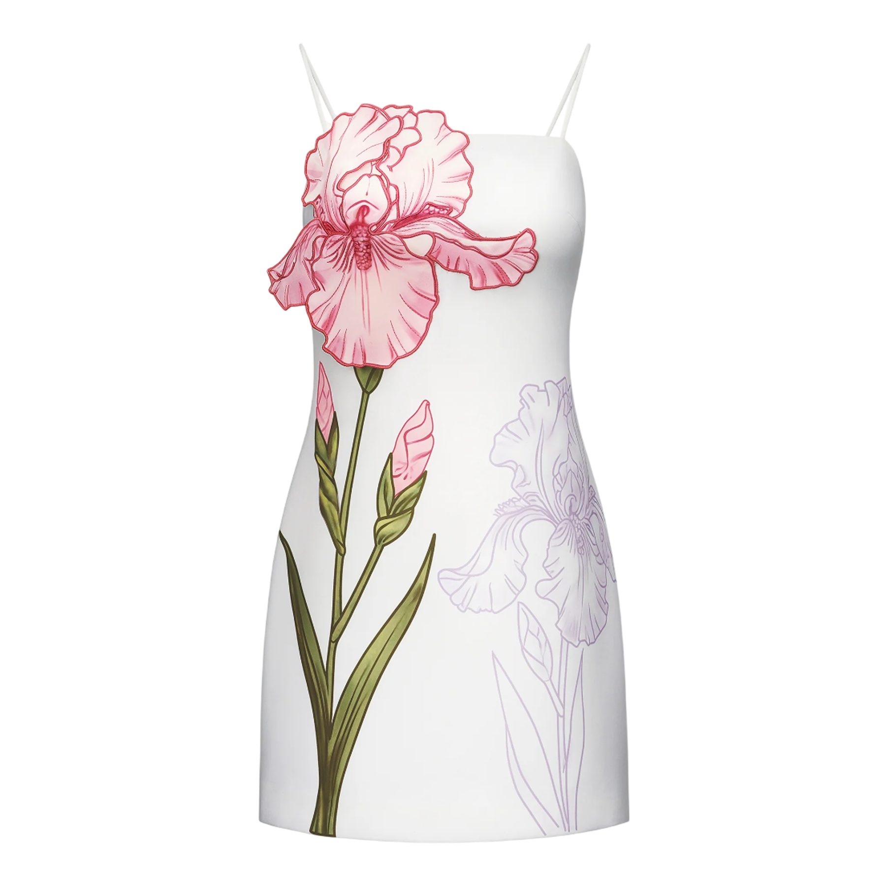 The JW PEI Iris Applique Mini Dress delivers contemporary femininity with botanical-inspired artistry and modern silhouette construction. Crafted from premium white fabric featuring detailed pink iris floral applique embellishments and green stem detailing throughout. The fitted mini dress design with thin shoulder straps creates an elegant statement piece perfect for special occasions.