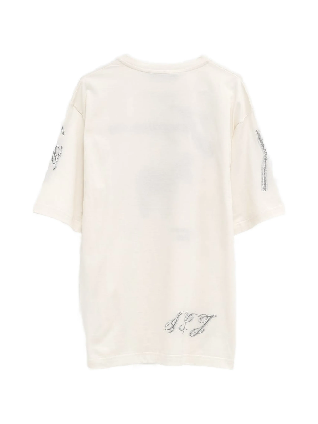 JACQUEMUS Le Tshirt Ane MC delivers French luxury with contemporary artistic design and relaxed sophistication. Crafted from premium cotton jersey in cream white, featuring signature embroidered donkey motif and script branding throughout. The oversized fit and artistic embellishments create a statement piece that embodies the brand's playful Mediterranean aesthetic.