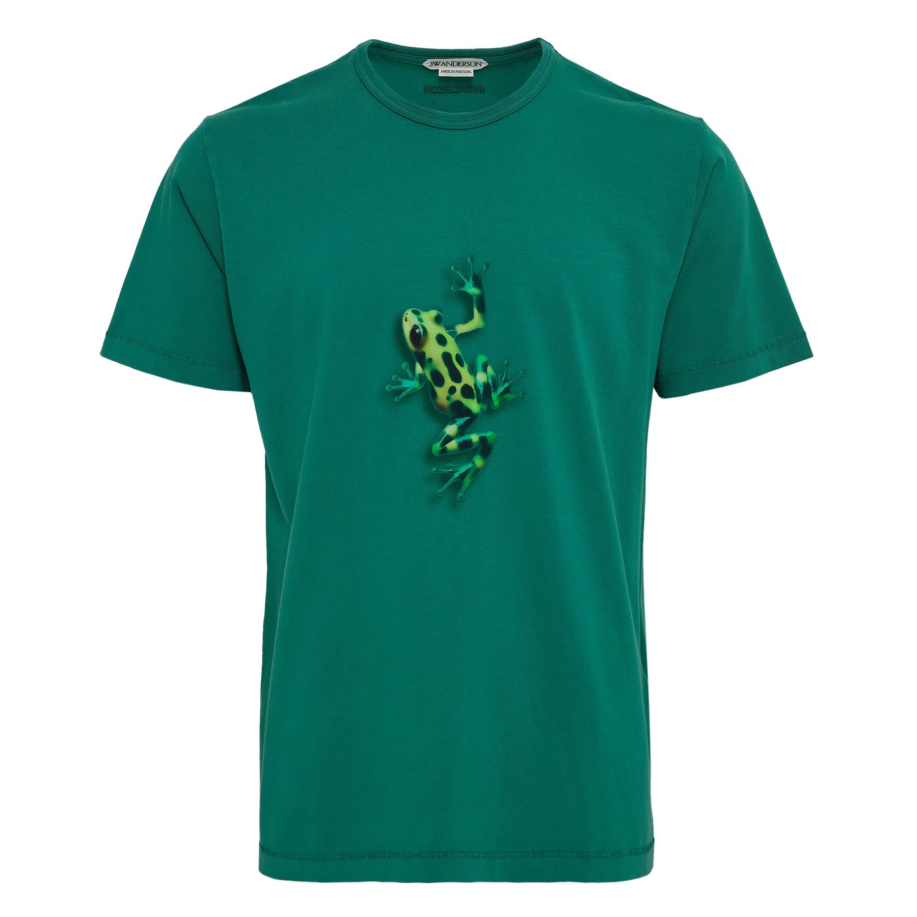 The JW Anderson Jumping Frog T-Shirt delivers playful luxury with distinctive graphic artistry and premium construction. Crafted from soft cotton jersey in vibrant emerald green, featuring a photorealistic poison dart frog print that showcases the brand's whimsical design aesthetic. The statement graphic and contemporary fit create a conversation piece that blends high fashion with streetwear sensibilities.