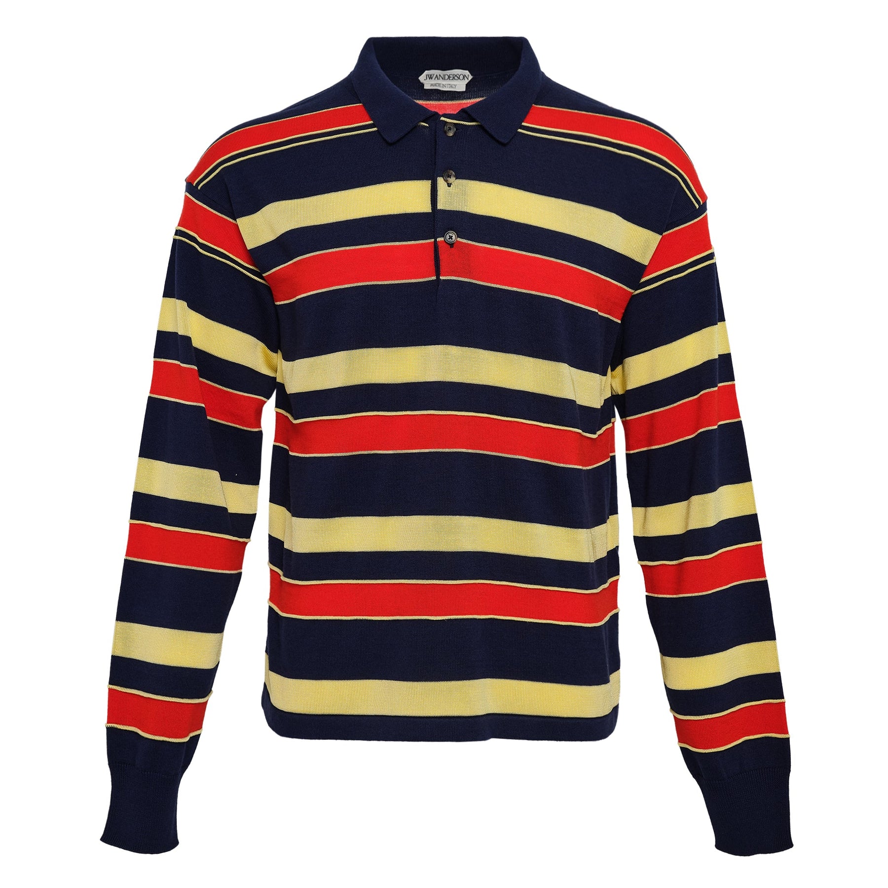The JW Anderson Knitted Rugby Polo delivers contemporary British design with classic rugby-inspired styling and modern sophistication. Crafted from premium knitted fabric in navy, red, and yellow horizontal stripes, featuring traditional polo collar and button placket construction. The structured knit construction and signature JW Anderson aesthetic create a refined take on sporting heritage for elevated casual wear.
