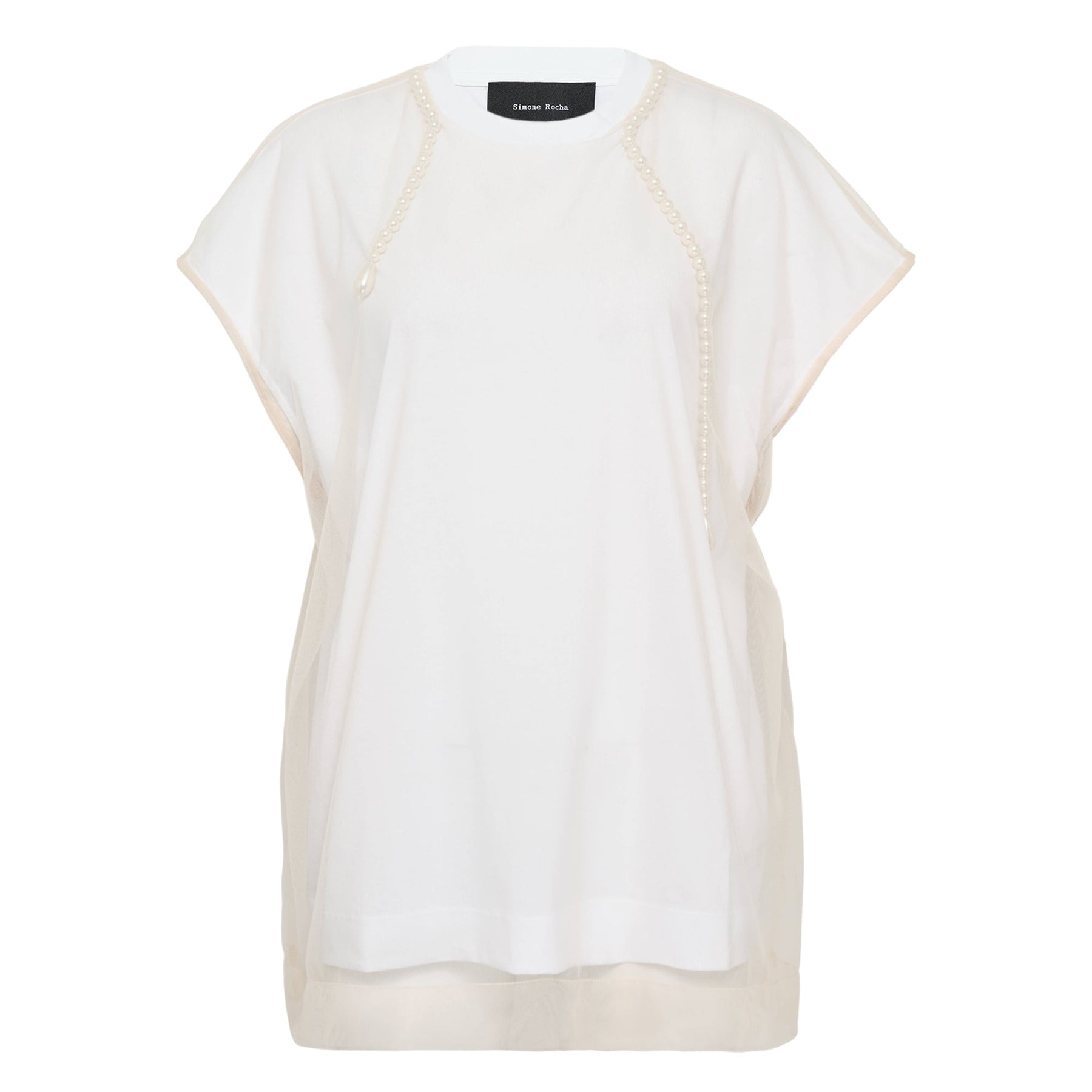 Simone Rocha Layered Liquid Smock T-Shirt delivers romantic femininity with architectural draping and contemporary silhouette. Crafted from lightweight fluid jersey in pristine white, featuring delicate beaded trim details and oversized cape sleeves. The layered construction and signature Simone Rocha embellishments create an ethereal statement piece for modern wardrobes.