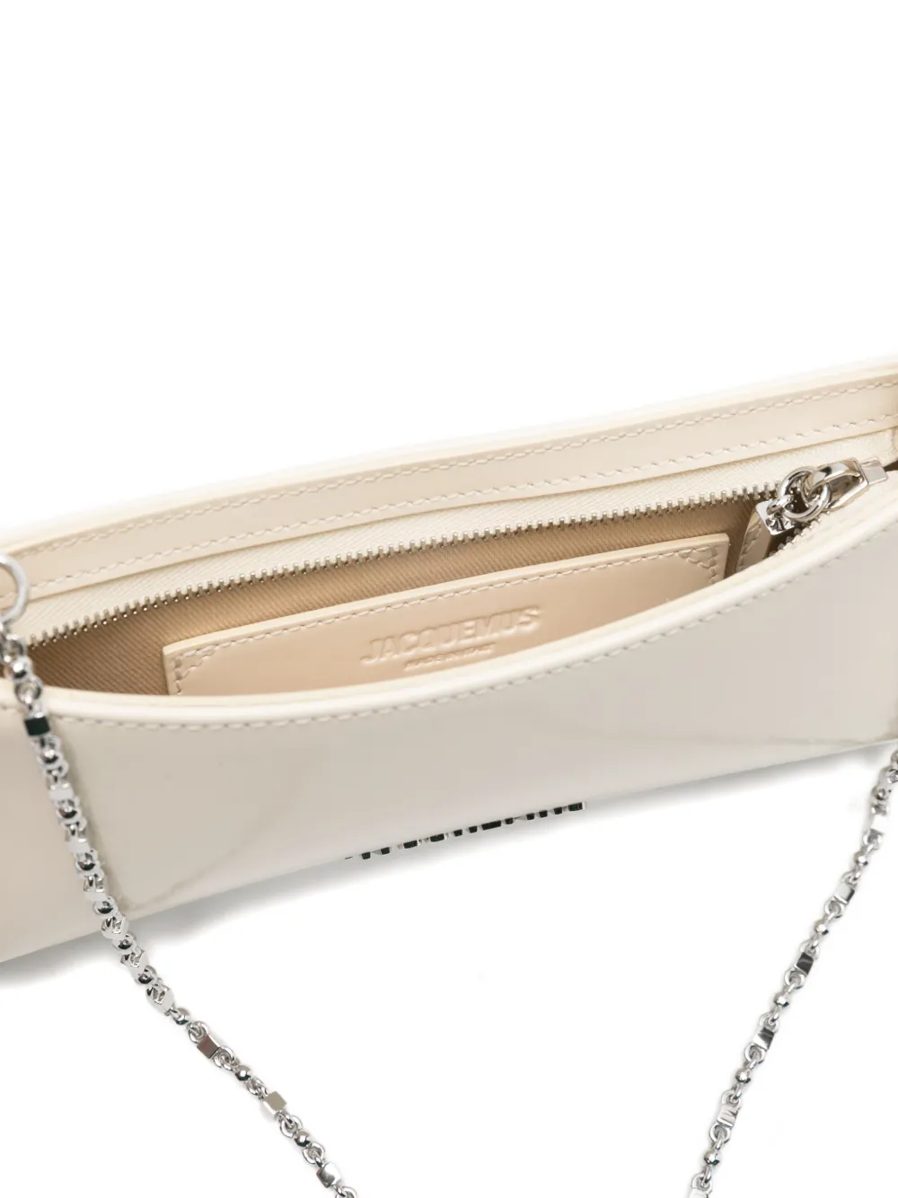 JACQUEMUS Le Petit Bisou Chaine delivers French minimalist elegance with sculptural curved construction and versatile chain strap functionality. Crafted from premium leather in sophisticated cream, featuring the brand's signature architectural silhouette and clean aesthetic. The compact hobo shape and detachable chain create an effortlessly chic accessory for day to evening wear.