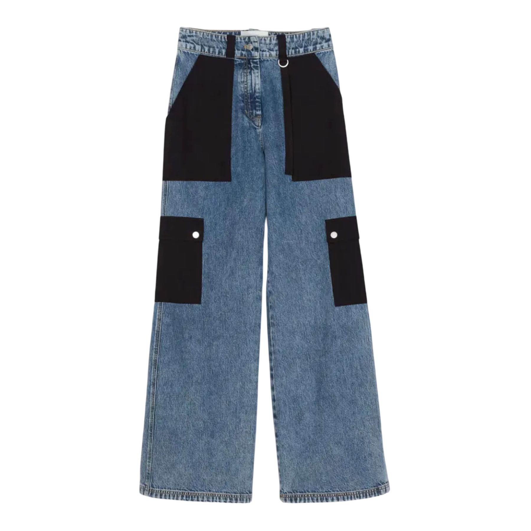 3.1 Phillip Lim Lightweight Denim Cargo Combo delivers contemporary streetwear with innovative fabric paneling and utilitarian functionality. Crafted from lightweight denim with contrasting black fabric panels, featuring cargo pockets and modern construction details. The wide-leg silhouette and mixed-material design create a bold statement piece for contemporary wardrobes.
