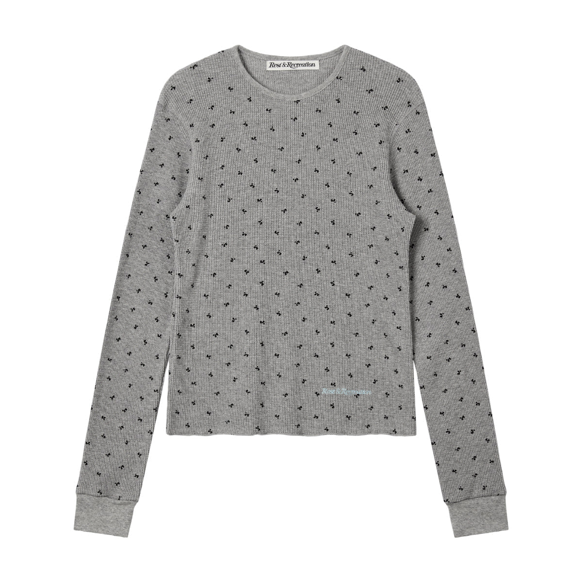 The Rest&Recreation Logo Pattern Waffle Top delivers contemporary comfort with distinctive textural detail. Crafted from premium waffle-knit cotton in sophisticated heather gray, featuring an all-over micro logo pattern for subtle brand recognition. The ribbed collar and cuffs create a refined casual silhouette perfect for elevated everyday styling.