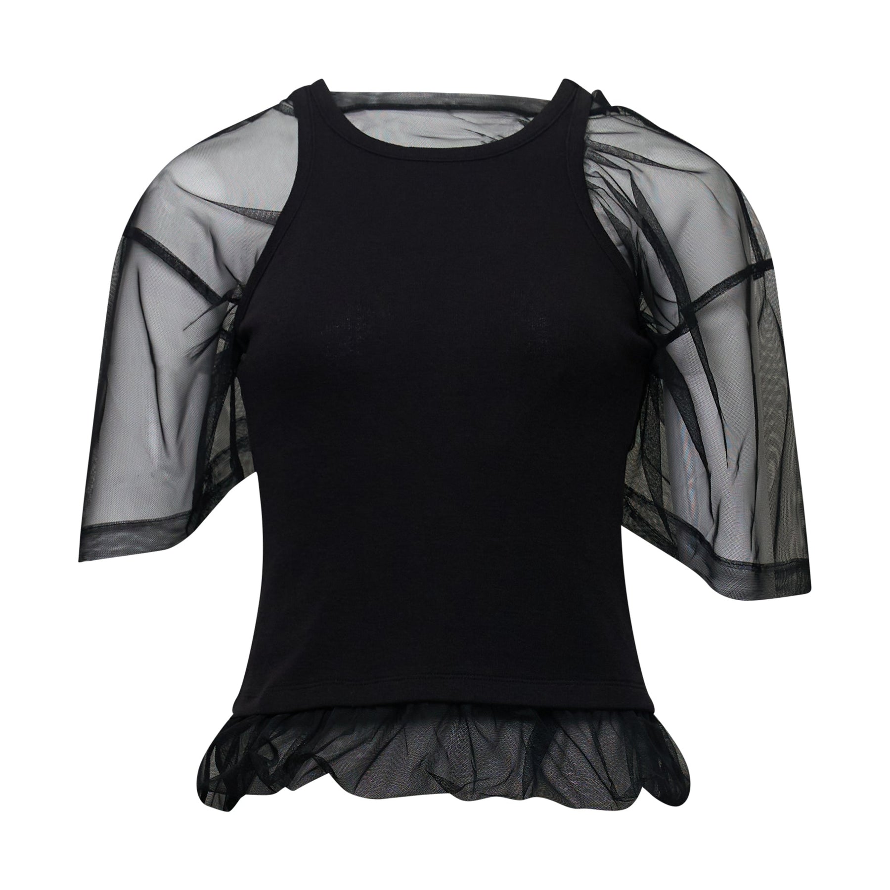 The YCH Mesh Layered Top delivers contemporary elegance with sheer mesh sleeves and structured layering. Crafted with a solid black bodice and delicate black mesh overlay featuring dramatic ruffle detailing at the hem. The halter-style neckline and short mesh sleeves create a sophisticated statement piece that balances coverage with modern transparency.