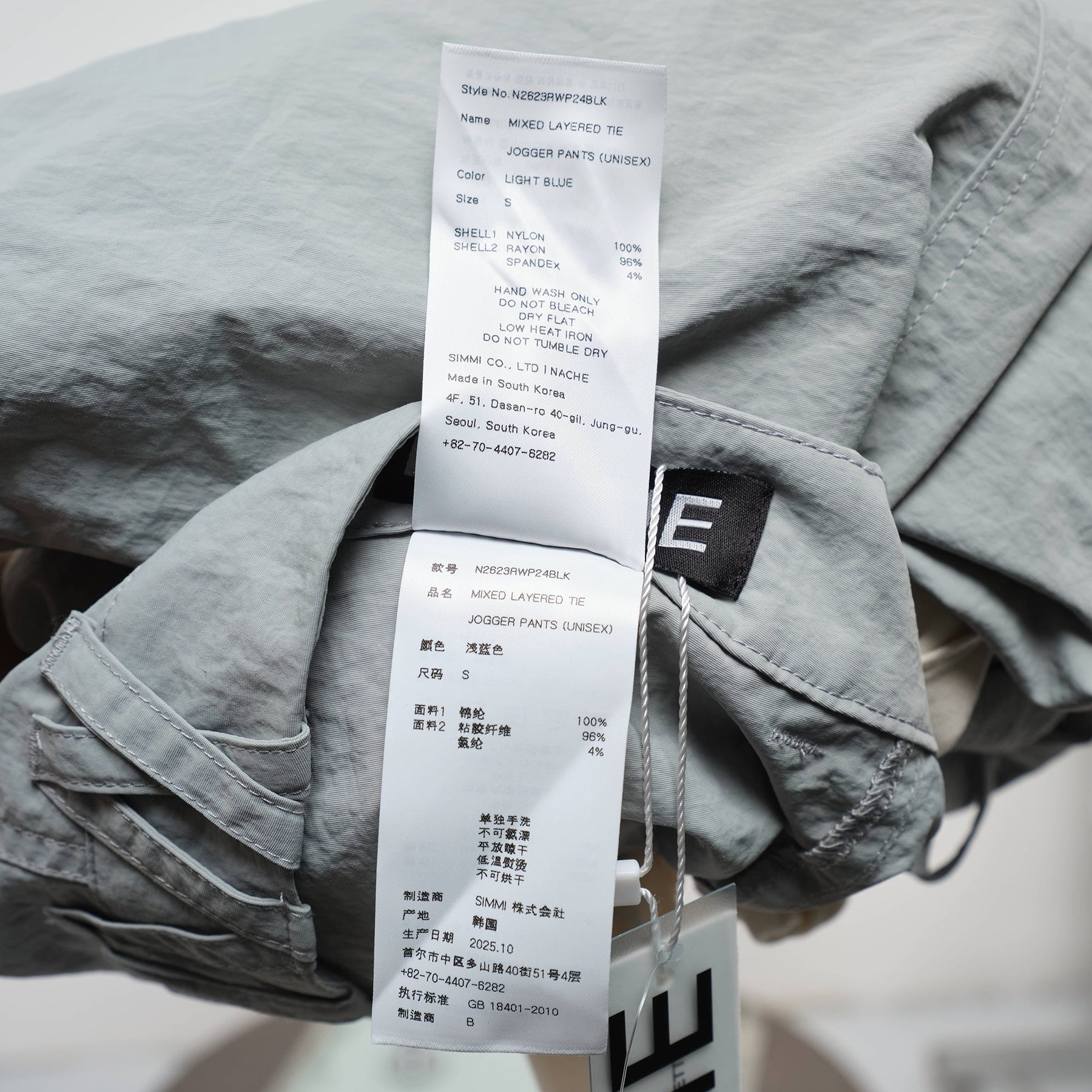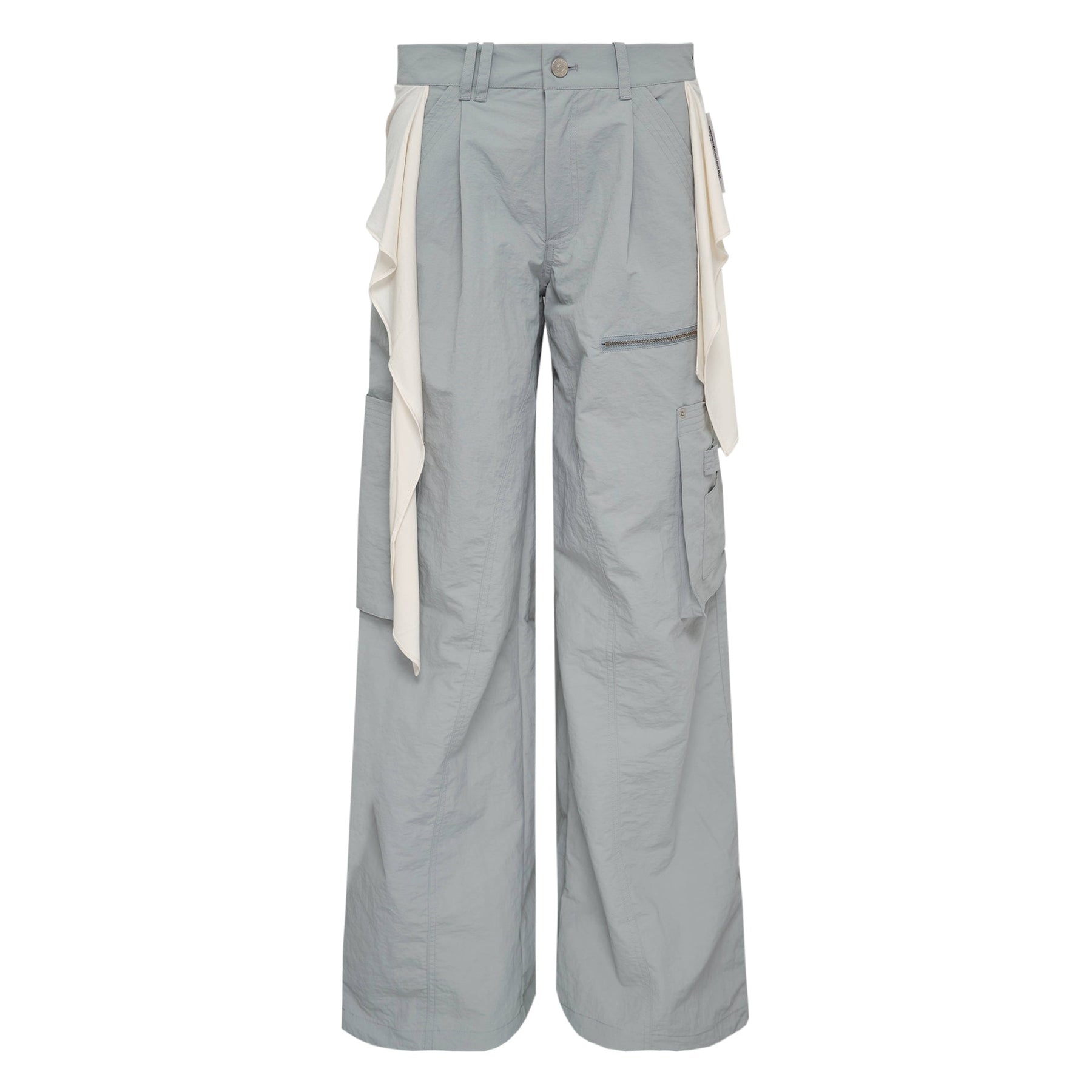 NACHE Mixed Layered Tie Jogger Pants deliver contemporary streetwear with architectural layering and adjustable styling elements. Crafted from lightweight cotton blend in soft sage green, featuring contrasting cream tie details and multiple cargo pockets throughout. The relaxed wide-leg silhouette and removable tie accents create versatile styling options for modern wardrobes.
