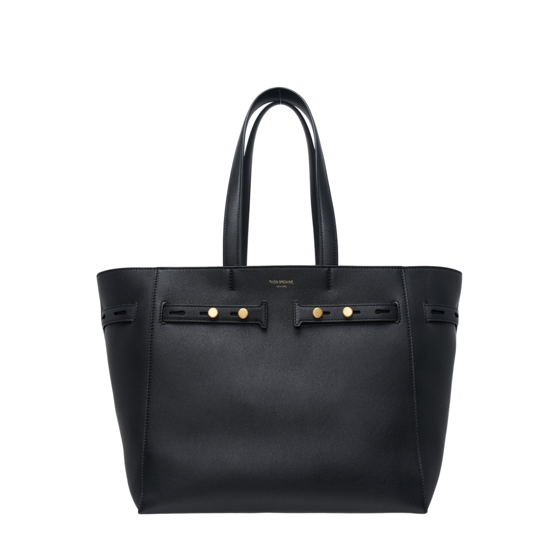 The Thom Browne Mrs. Thom Cabas Bag delivers sophisticated luxury with architectural precision and premium craftsmanship. Constructed from supple black leather with signature gold-tone hardware and distinctive bow details that embody the brand's refined aesthetic. The structured silhouette and meticulous construction create an elevated tote perfect for modern professional wardrobes.