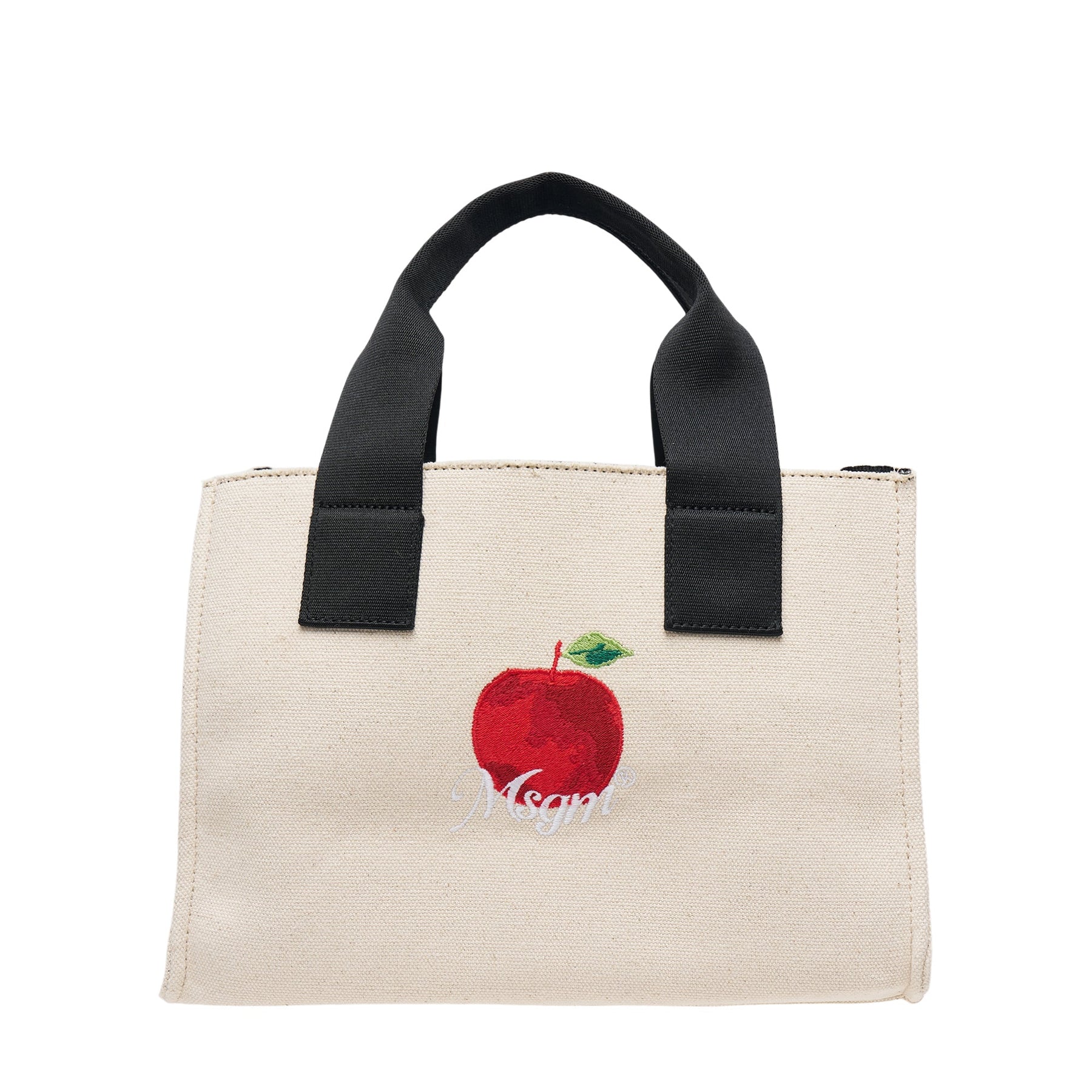 The MSGM Small Apple Tote Bag delivers playful luxury with eco-conscious design and signature Italian craftsmanship. Crafted from durable vegan canvas in natural beige with embroidered red apple motif and contrast black handles. The compact silhouette and whimsical branding create a statement accessory for contemporary lifestyles.