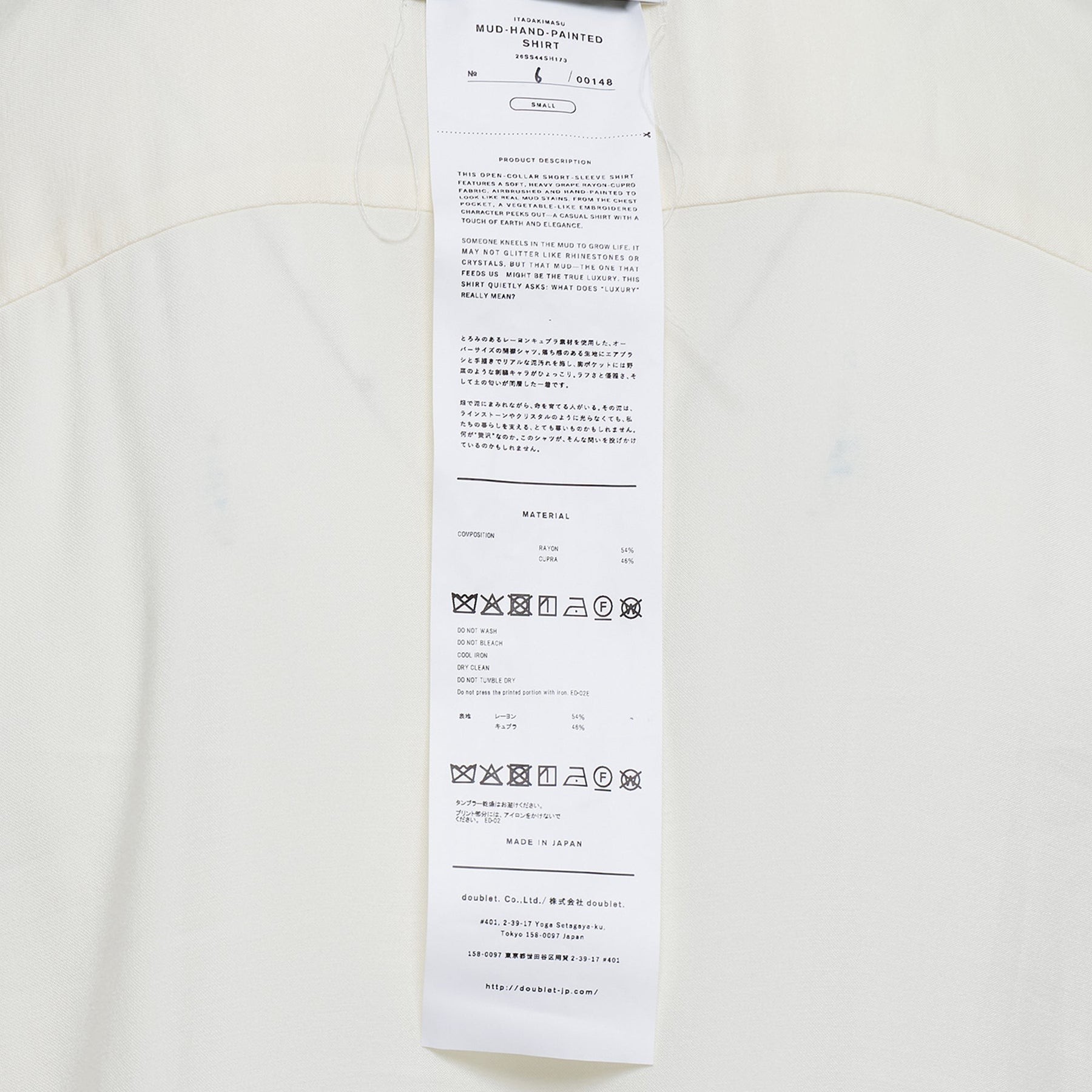 The doublet Mud Hand Painted Shirt delivers avant-garde artistry with unique hand-painted detailing and Japanese craftsmanship. Crafted from premium cotton with distinctive mud-toned abstract brush strokes across a cream base, featuring traditional button closure and relaxed silhouette. The artistic paint treatment and signature doublet aesthetic create a wearable art piece for contemporary wardrobes.