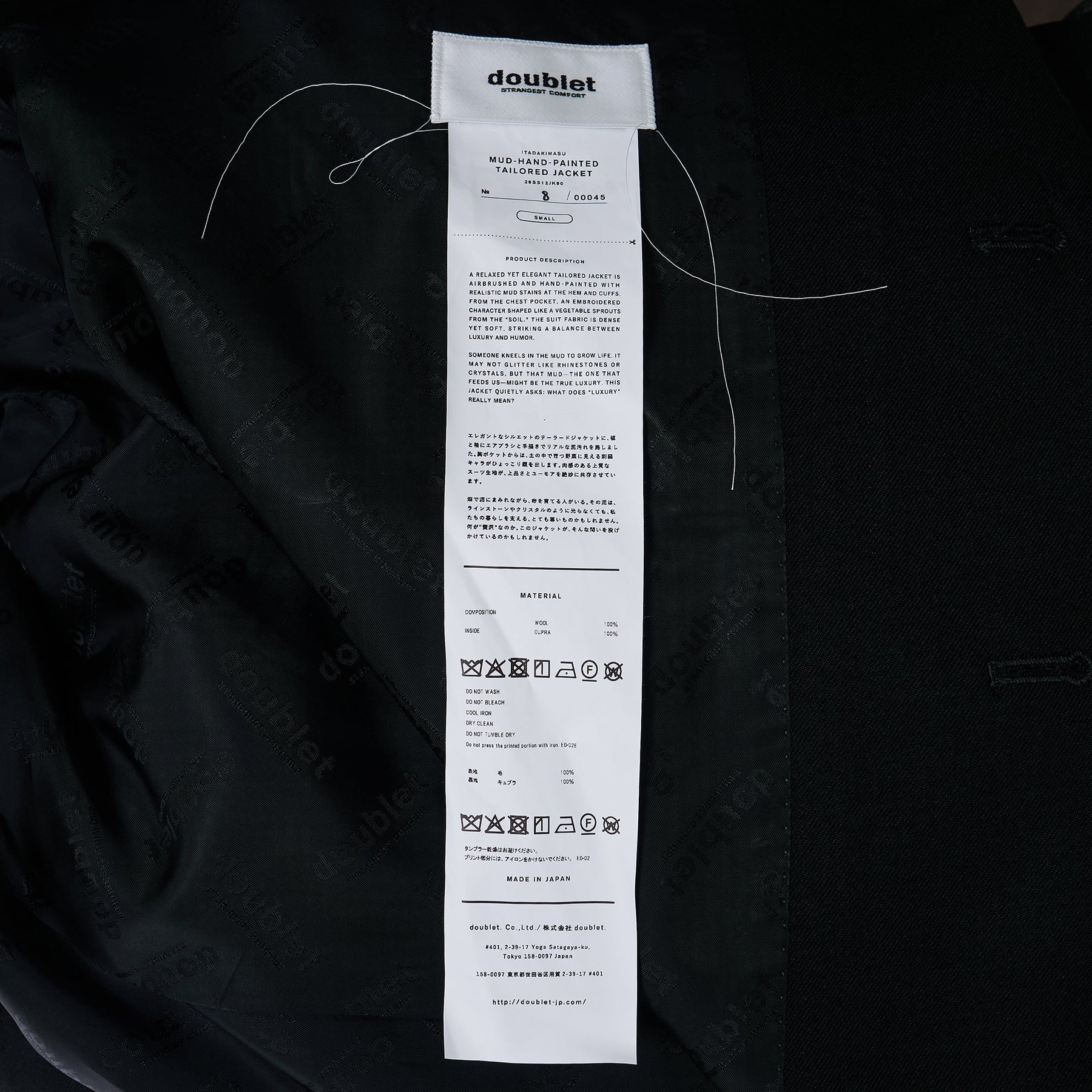 The doublet Mud Hand Painted Tailored Jacket delivers avant-garde artistry with sophisticated tailoring and unique paint treatment. Crafted from premium black wool suiting fabric with hand-applied mud paint effects creating an ombré gradient from pristine black to weathered brown tones. The contrast between formal tailoring and distressed artistic elements creates doublet's signature subversive aesthetic.