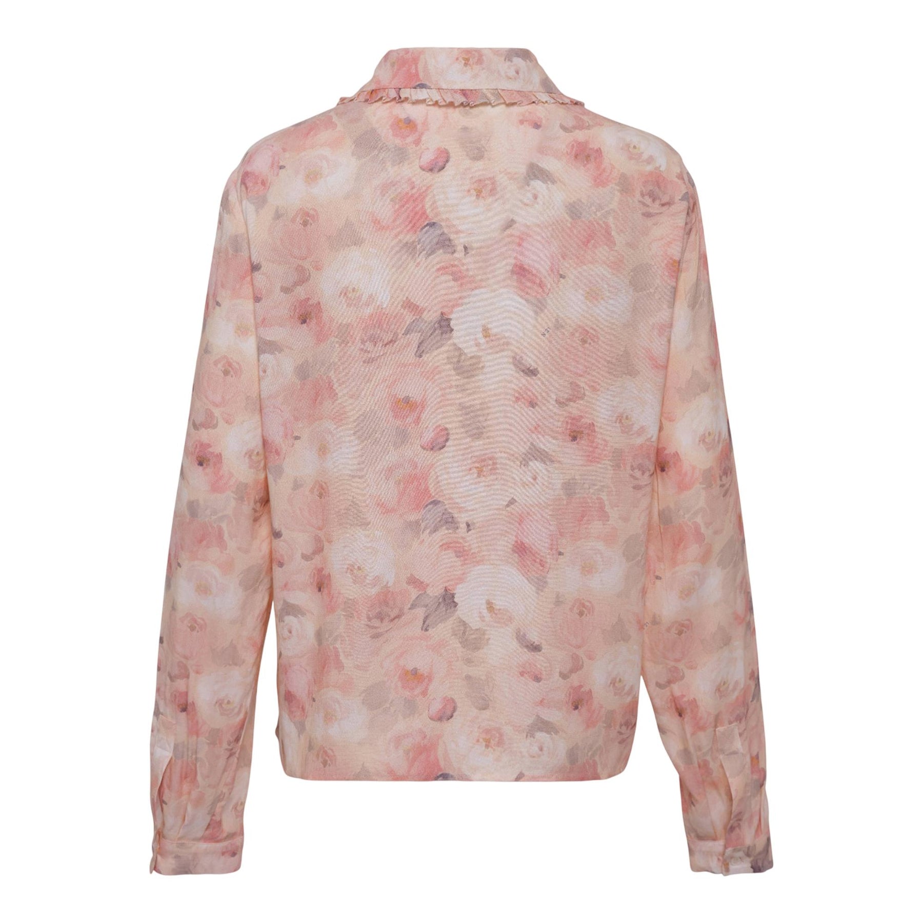 Floral shirt with mini ruffles and pockets made of light and soft fabric. It features a floral pattern in shades of pink and beige, a classic collar and a front button closure. The fit is regular, with long sleeves and pleated details along the button placket and collar. The shirt includes four small patch pockets on the front.